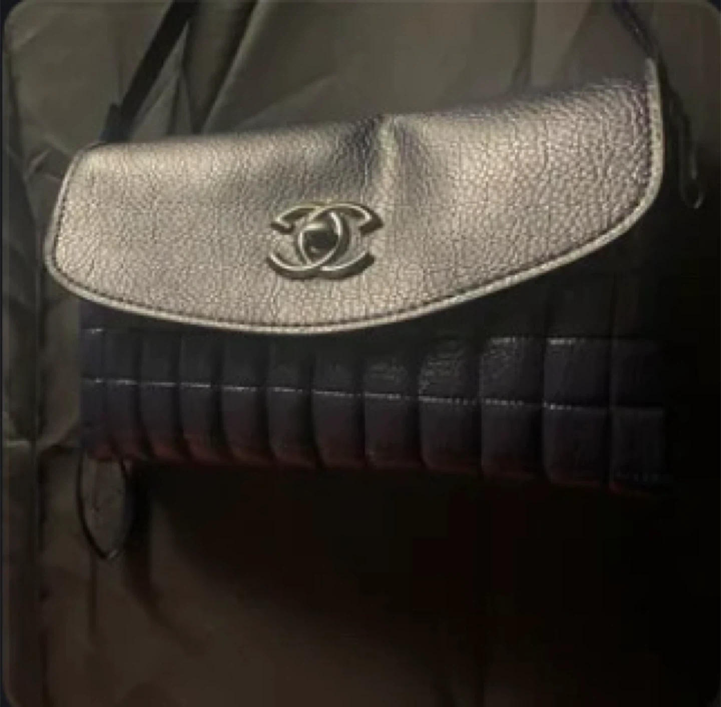 This is a stylish Chanel flap shoulder bag. It's a dark navy or black colour with the iconic Chanel logo hardware. The bag features quilted detailing on the lower portion.