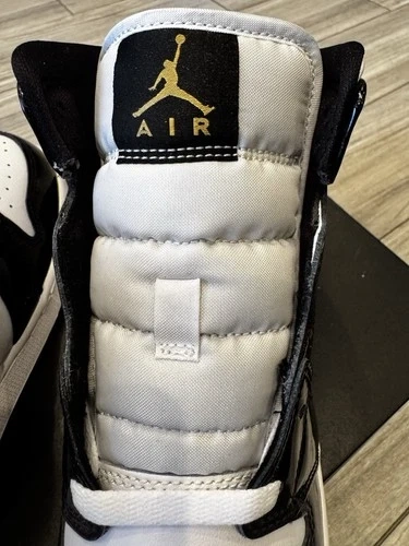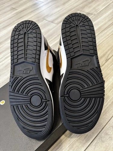 The Jordan Air Jordan 1 Mid SE GS in Black Metallic Gold White features a stylish colorblock pattern with a round toe and lace-up closure. Made with patent leather material, these sneakers have a flat heel and rubber outsole, perfect for casual wear or basketball activities. The iconic Air Jordan brand logo adds a touch of sports theme to these sneakers, suitable for both boys and girls in size 6.5Y or 8W. Ideal for summer, fall, and spring seasons.