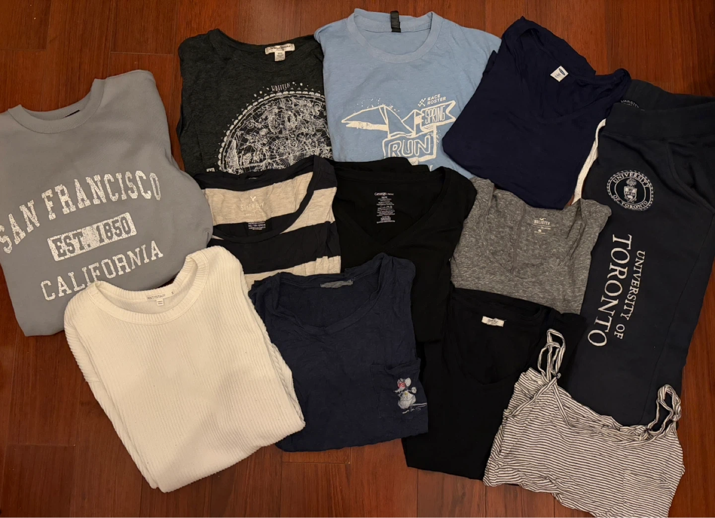 Selling 6 t-shirts, 2 long sleeves, 2 tanks, 1 crew neck and 1 pair of sweatpants all for $15!