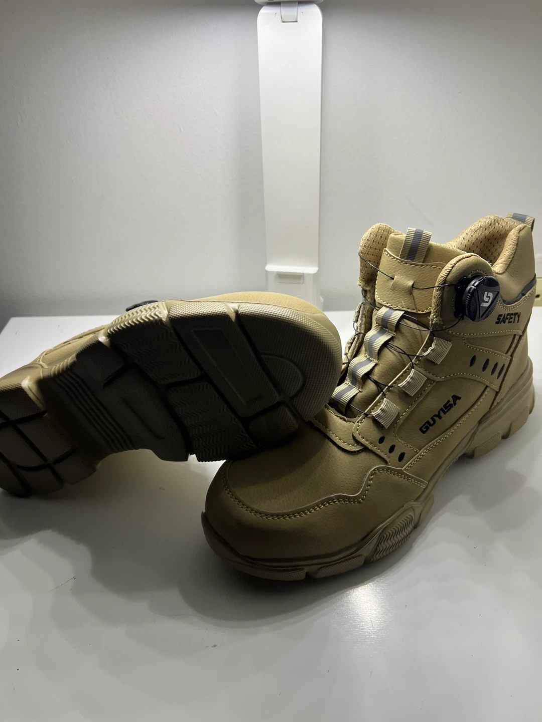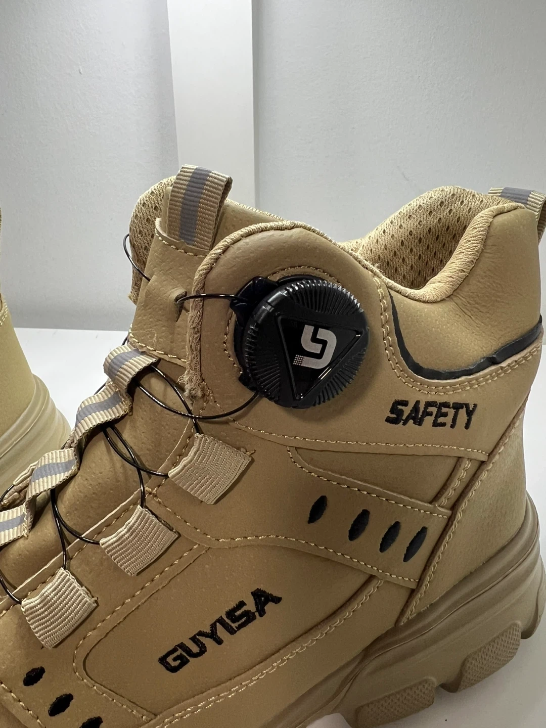 GUYISA safety boots. Tan color. Features a Boa lacing system for a quick and secure fit. Designed for work and protection. Includes extra laces. Size 9.