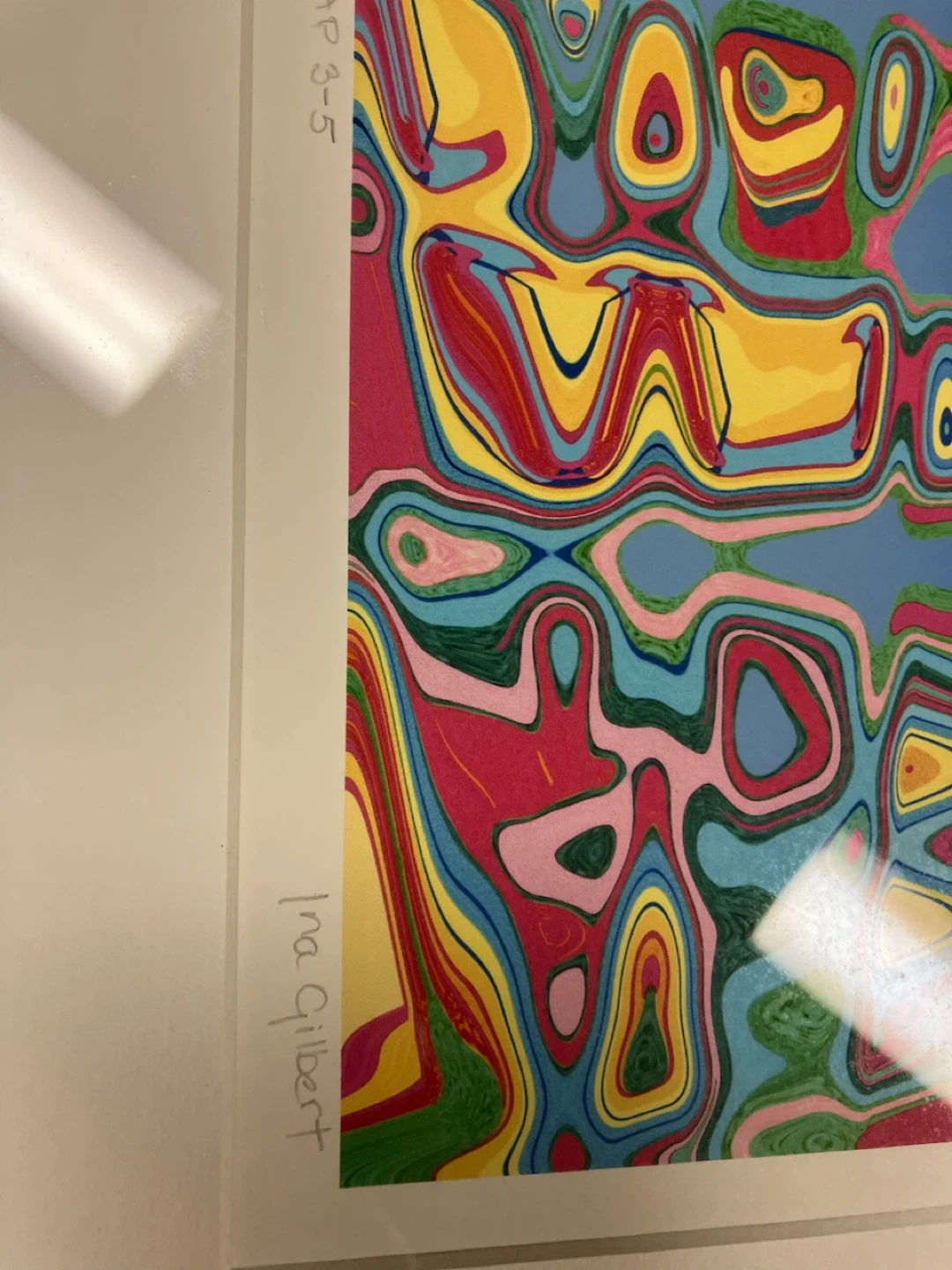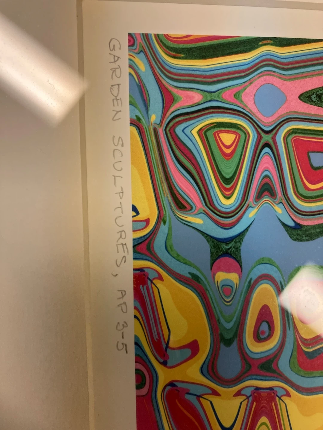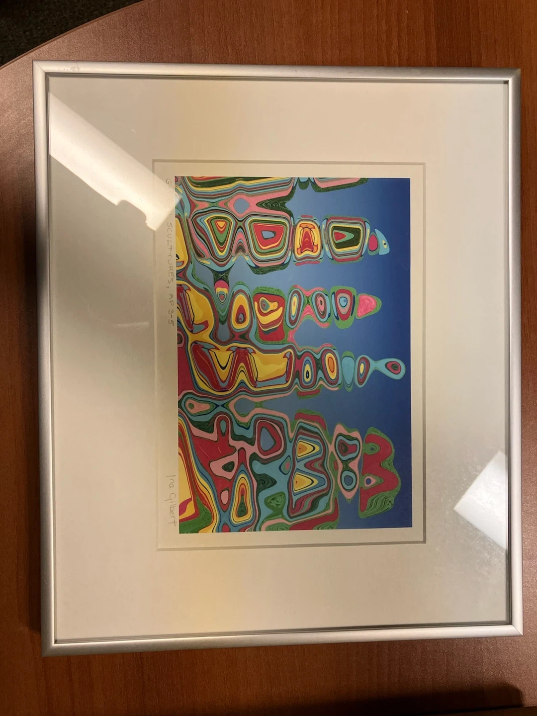 This framed print is titled "Garden Sculptures" and is artist proof 3-5 by Ina Gilbert. It features a vibrant abstract design in a silver frame. The print is ready to hang and would make a colourful addition to any space.