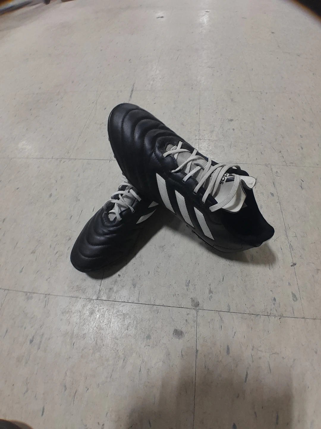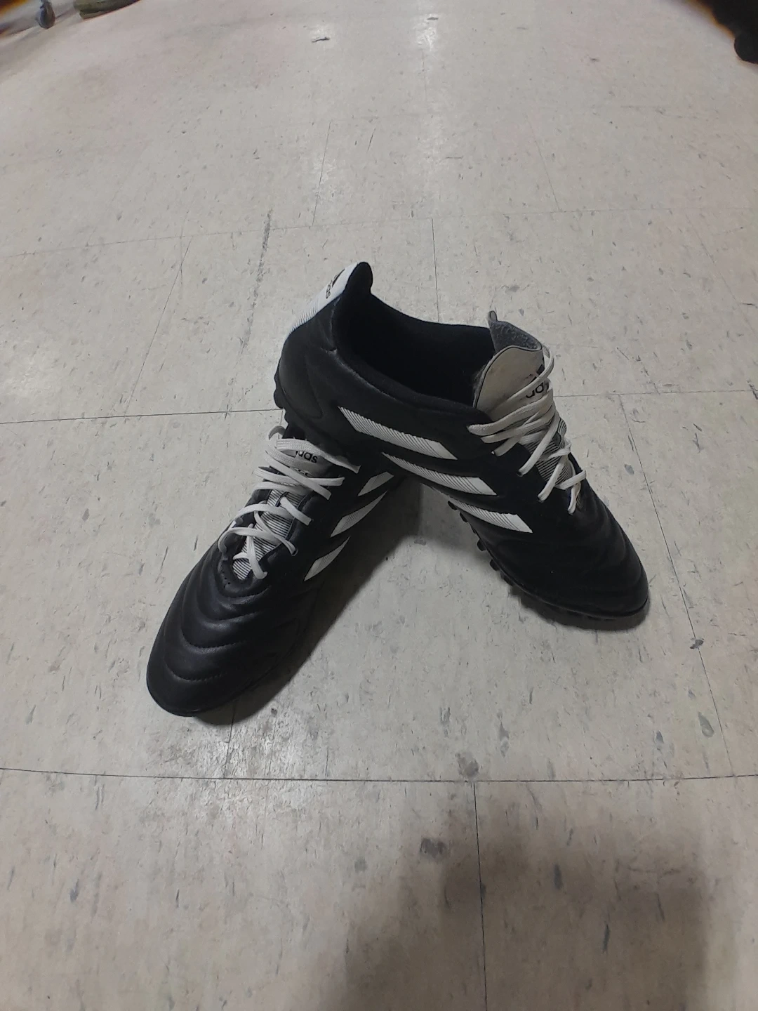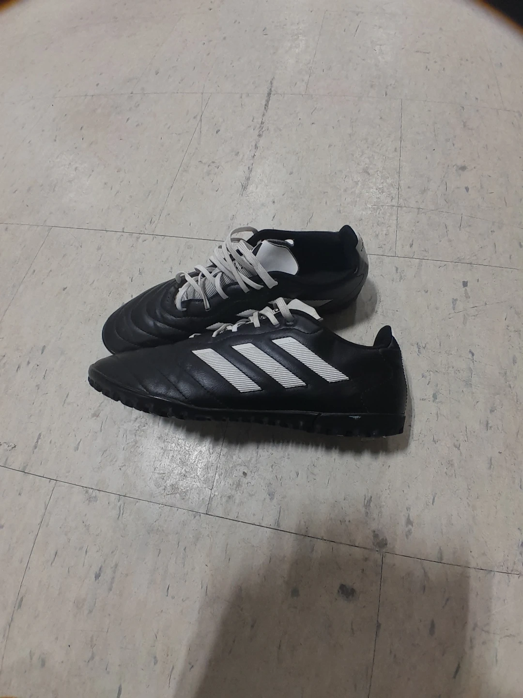 Black Adidas soccer cleats with white stripes and laces. These shoes are designed for playing soccer on turf fields. They feature a comfortable fit and good grip for quick movements men's size 8