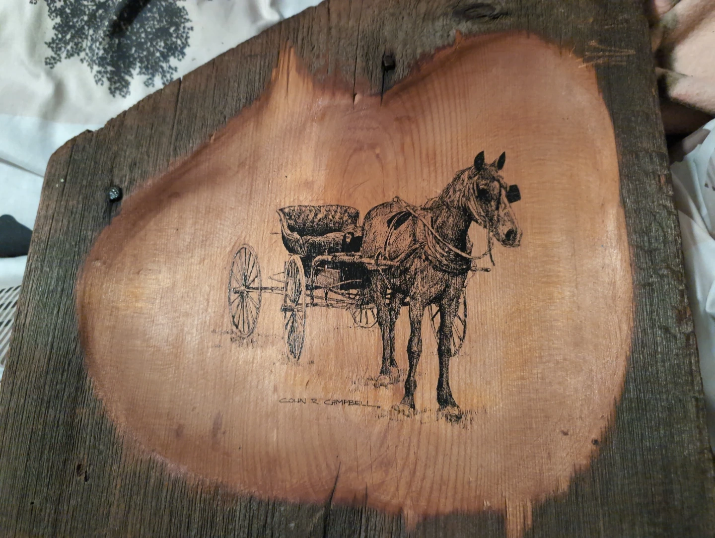 Unique piece of wood art featuring a horse-drawn carriage by Colin R Campbell! It's a striking piece that would look great in any room looks to be made out of oak wood and the horse drawing looks to be burnt into the wood