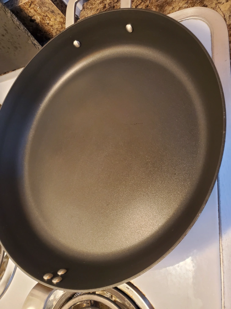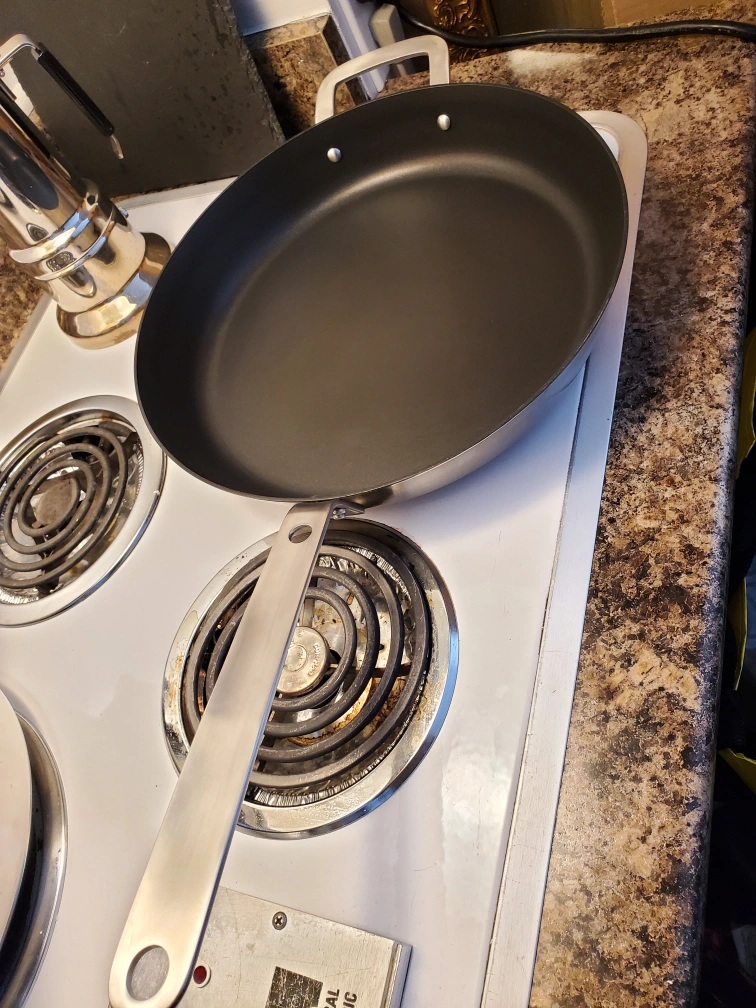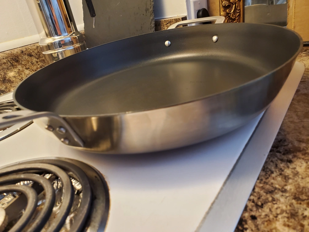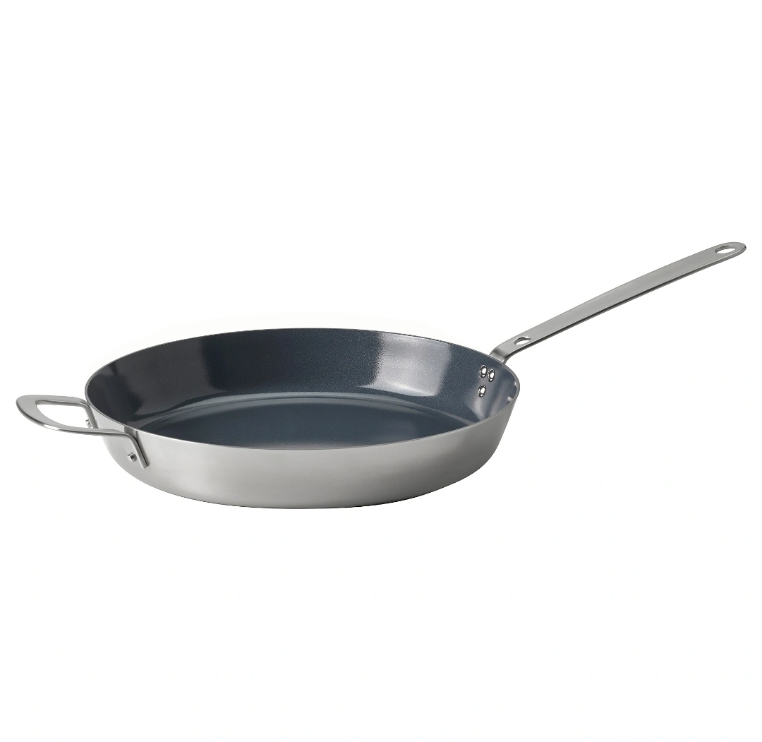 Hemkomst frying pan from IKEA! This pan is stainless steel with a non-stick coating. It measures 32 cm (13 inches) in diameter. Originally bought for $39.99