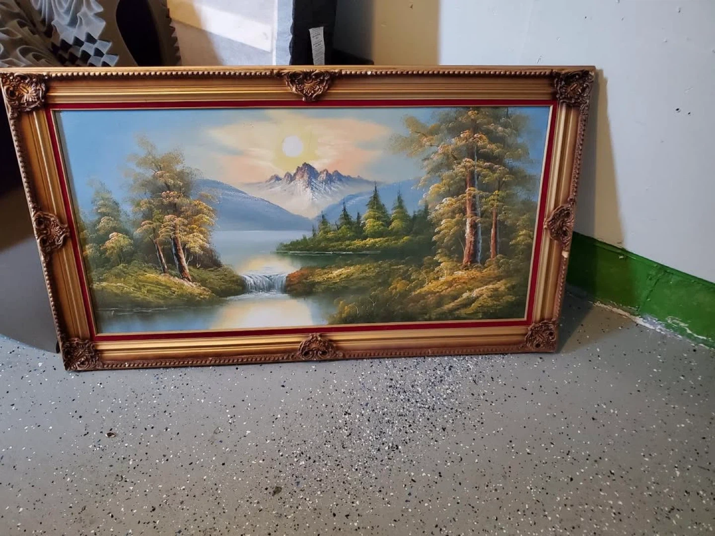 This is a framed landscape painting depicting a serene scene with mountains, a lake, and a waterfall. It's presented in an ornate gold-coloured frame with red matting. The artwork adds a touch of nature's beauty to any room.
