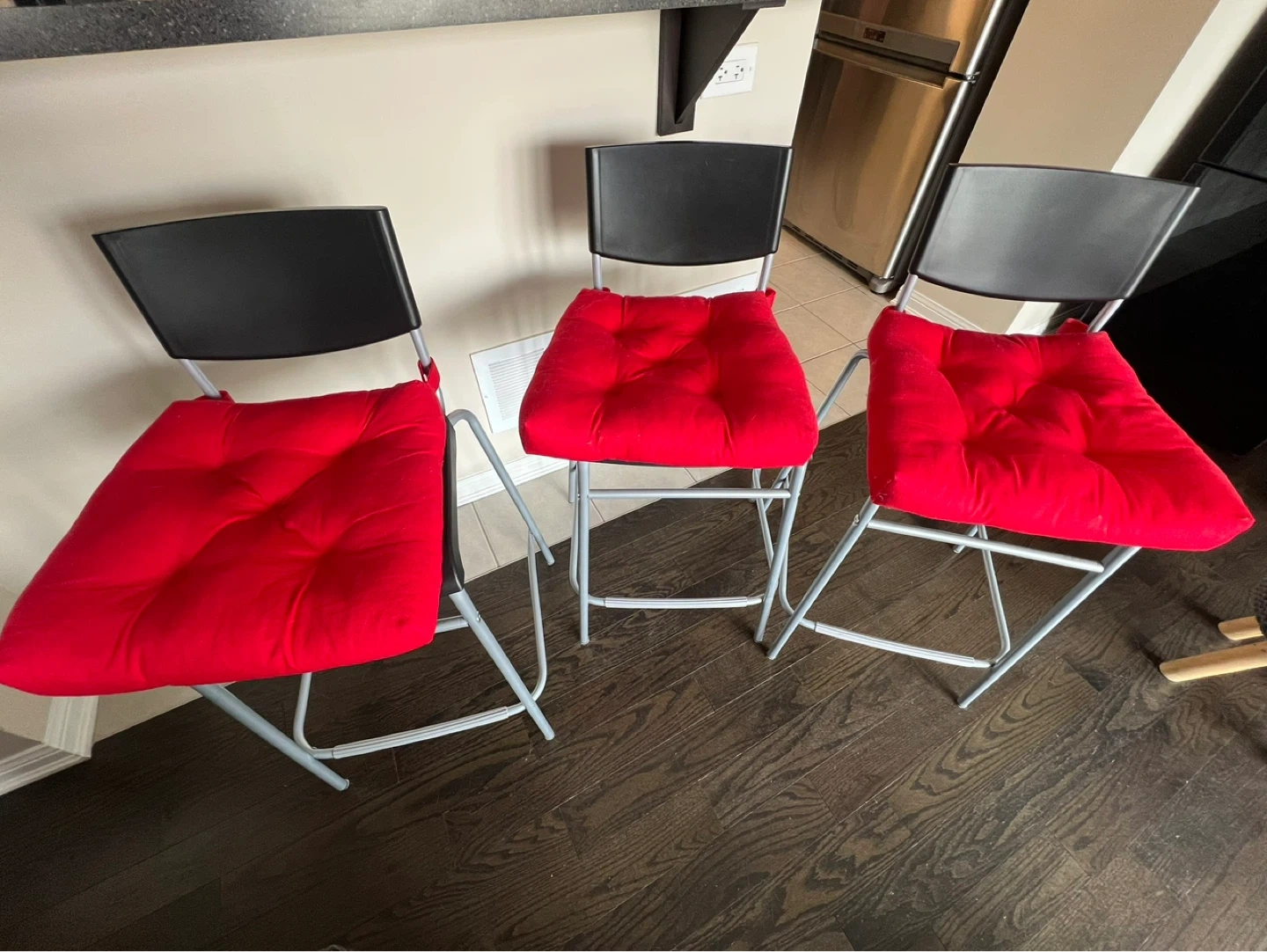 Three black bar stools come with bright red seat cushions. The metal frames are grey and the seats are a durable black plastic. These chairs are perfect for extra seating at your kitchen counter or home bar.