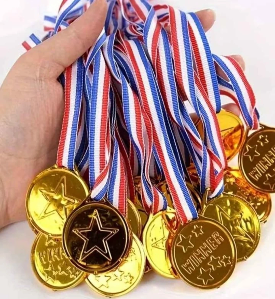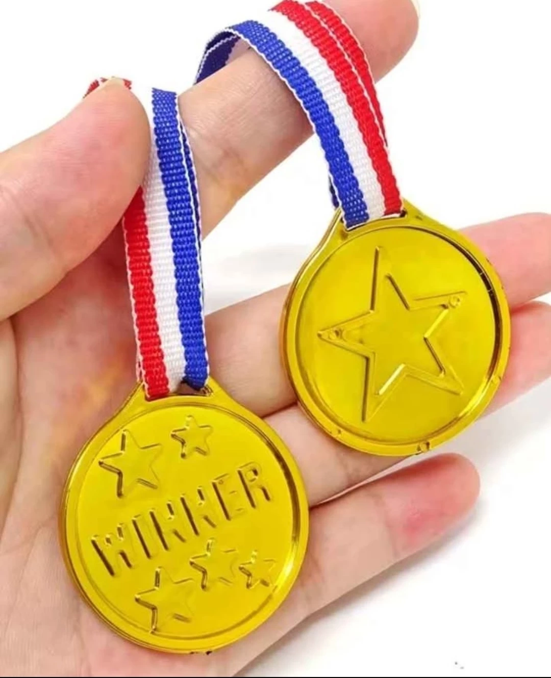Ten gold medals with patriotic ribbons for your winners. Each medal features a star design or the word 'WINNER' in raised lettering. Medal diameter is approximately 3.6cm (1.4 inches). These are great for awarding achievements at parties or events!