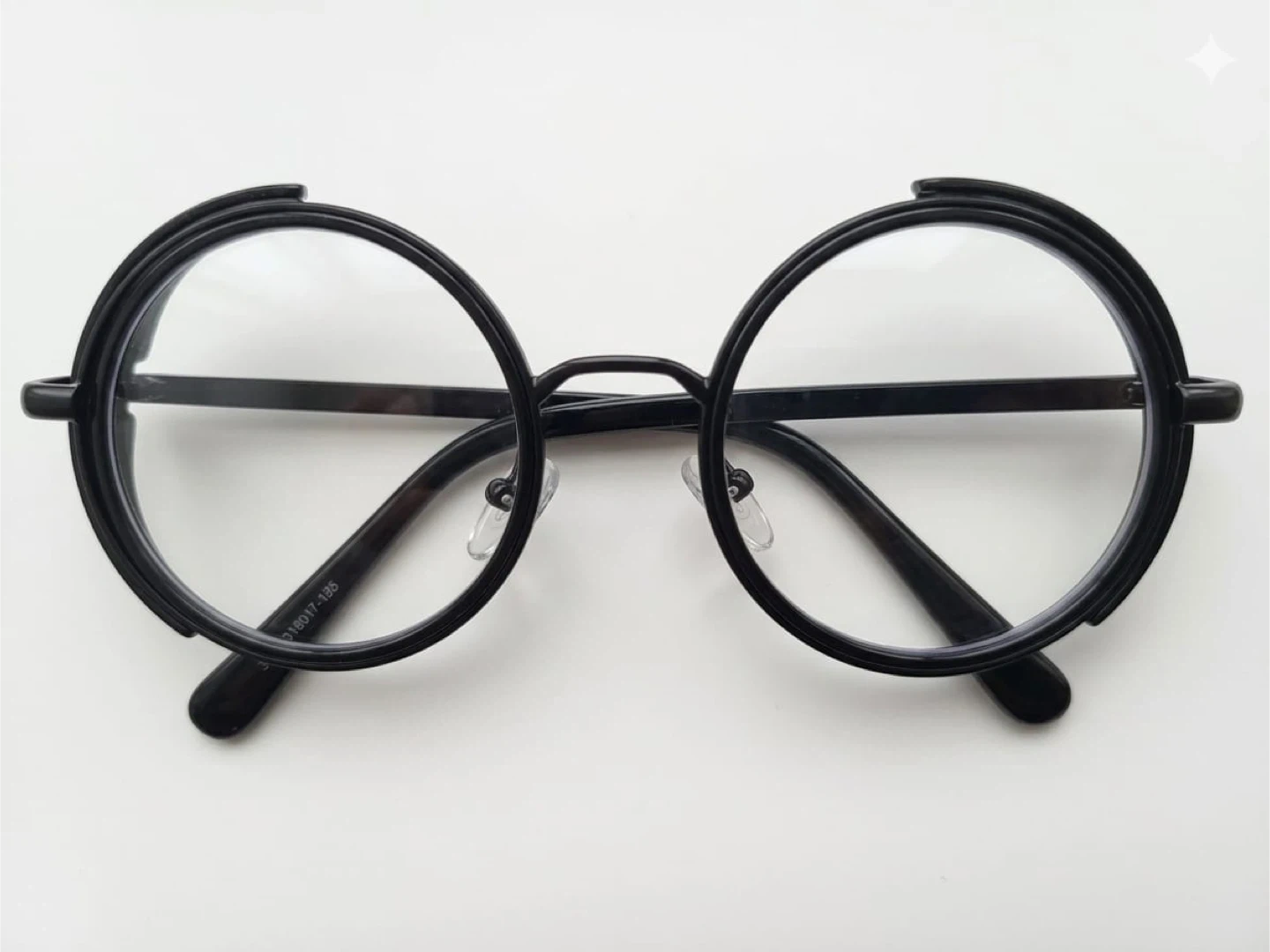 These round eyeglasses have a distinctive steampunk-inspired design. They feature black frames with unique textured side shields. These glasses are a statement accessory!