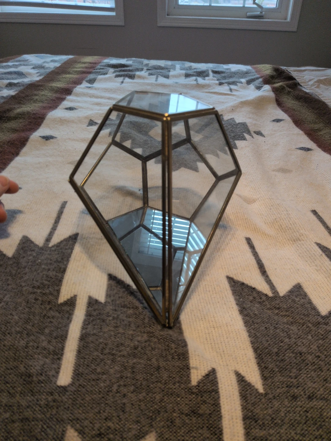 This geometric terrarium features clear glass panels with a brass-toned metal frame. It's a unique decorative piece for displaying small plants or air plants. It's suitable for adding a touch of modern decor to any shelf or tabletop.