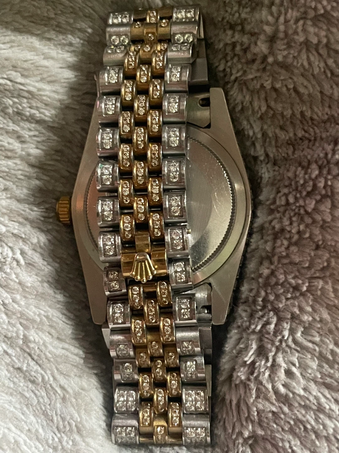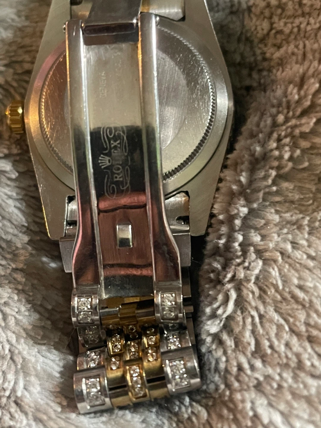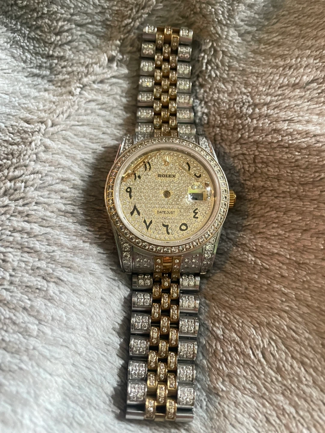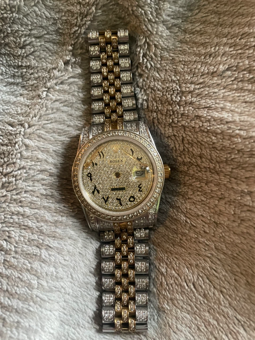 It's a dazzling Rolex Datejust watch with a two-tone jubilee band. This timepiece features a diamond-encrusted bezel and dial with Arabic numerals. Need gone asap message me for inquiries I’m willing to negotiate due to clock being broken