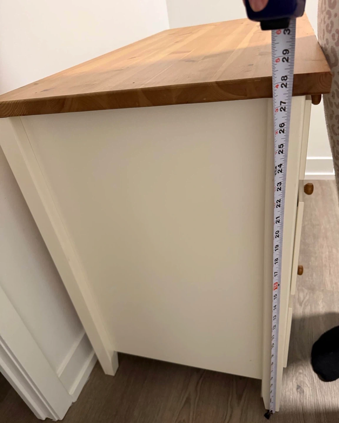 This dresser features a natural pine wood top and four white drawers with wooden knobs. The top measures 35 inches in length and 20 inches in depth, while the dresser itself is 28 inches tall. It's a great size for a bedroom or nursery!