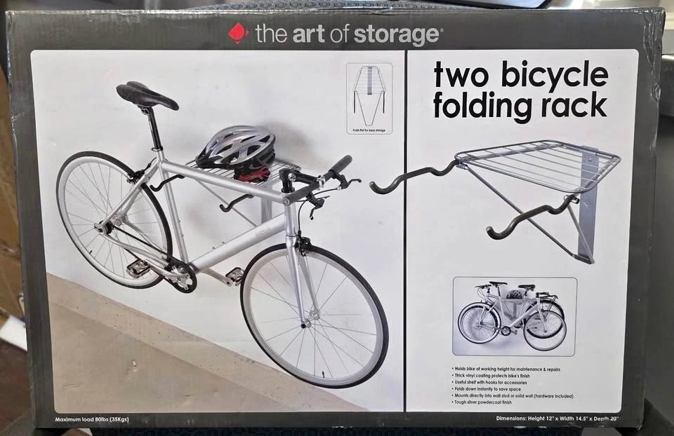 NEW IN BOX 2 bike folding rack by Art of Storage. Retails $94.99+tax. Holds bike at working height for maintenance & repairs. Thick vinyl coating protects bike's finish. Useful shelf with hooks for accessories. Folds down instantly to save space. Mounts directly into wall stud or solid wall (hardware included). Tough silver powdercoat finish. Smoke free, pet free home. $40. P-U Drew St in Woodstock.