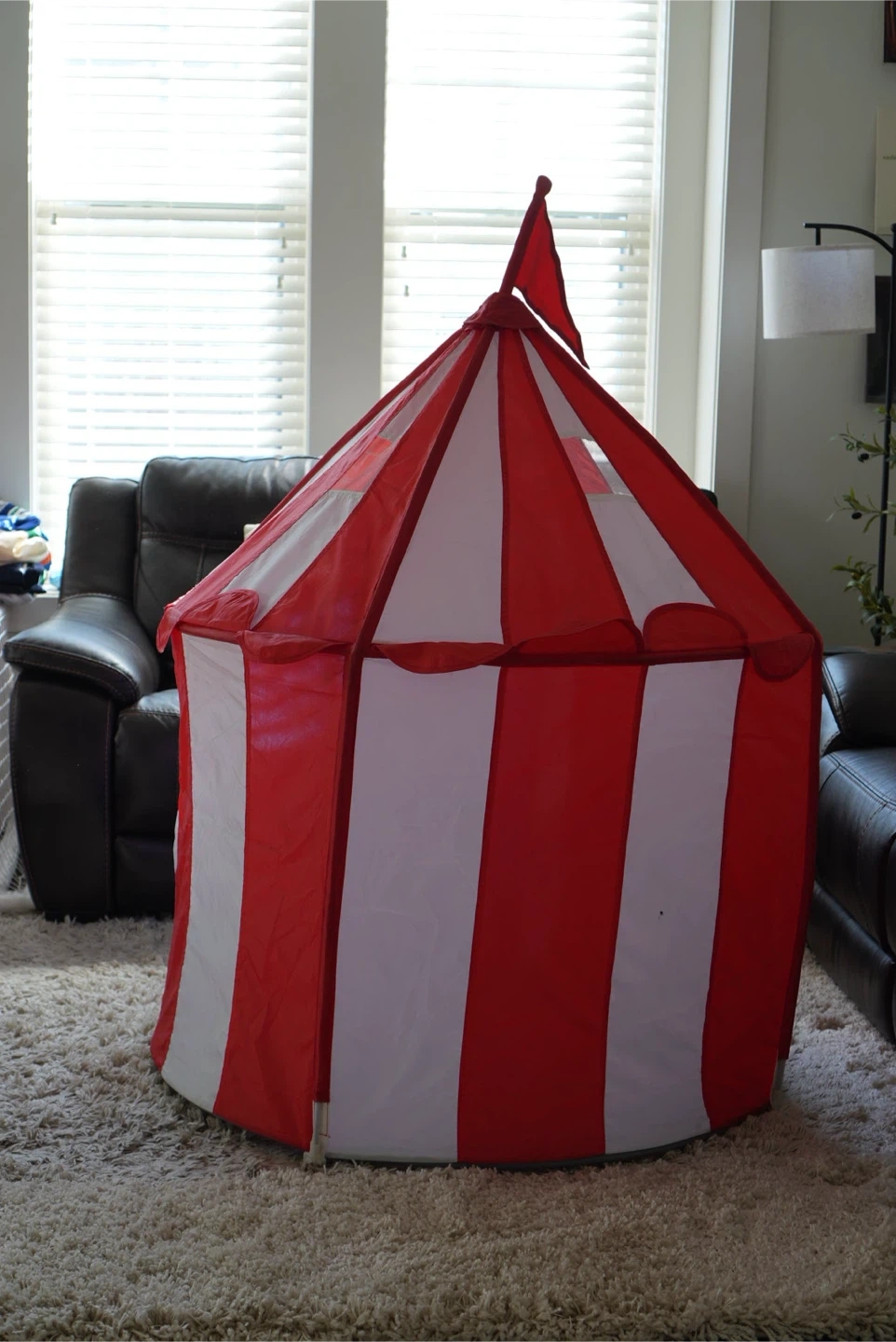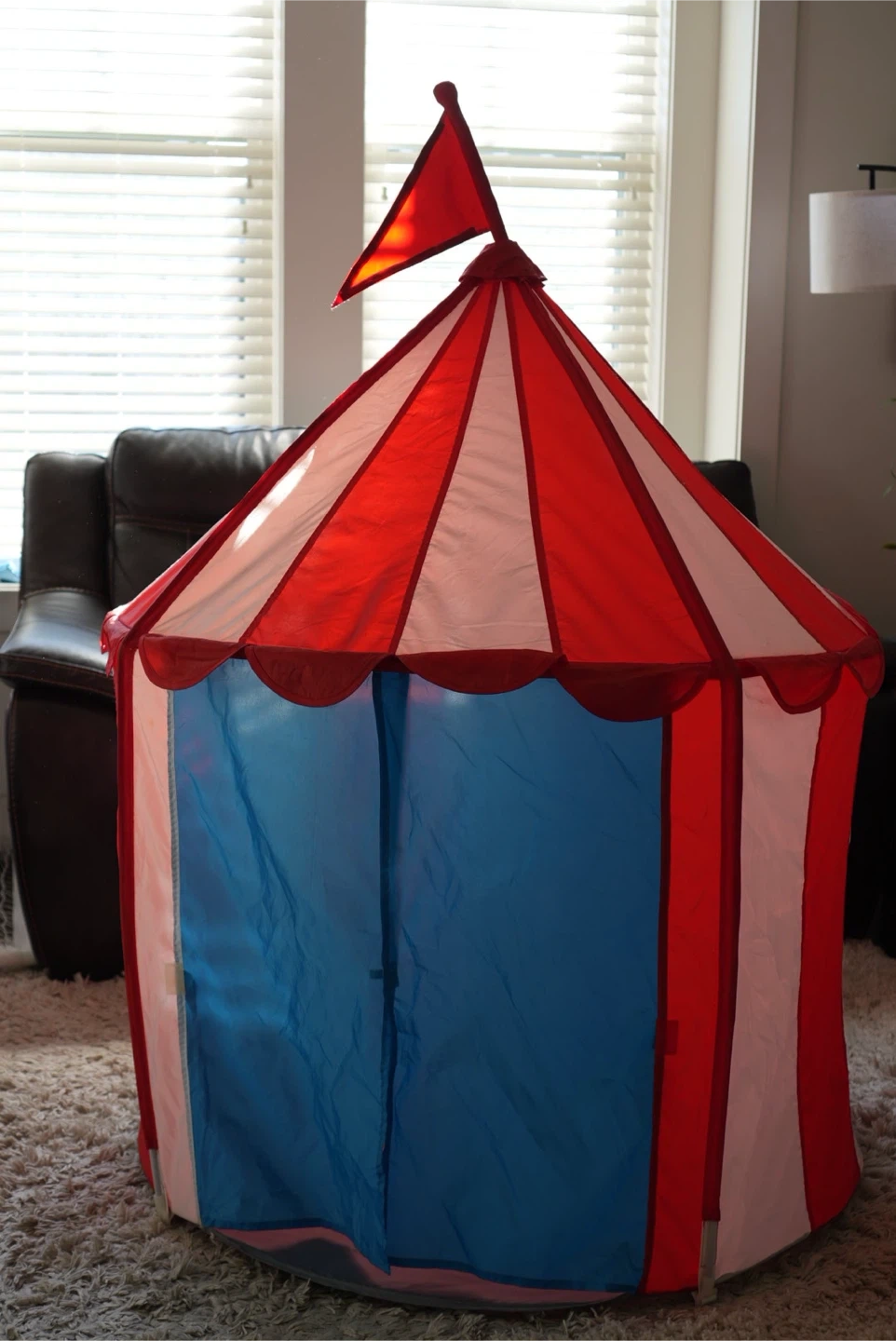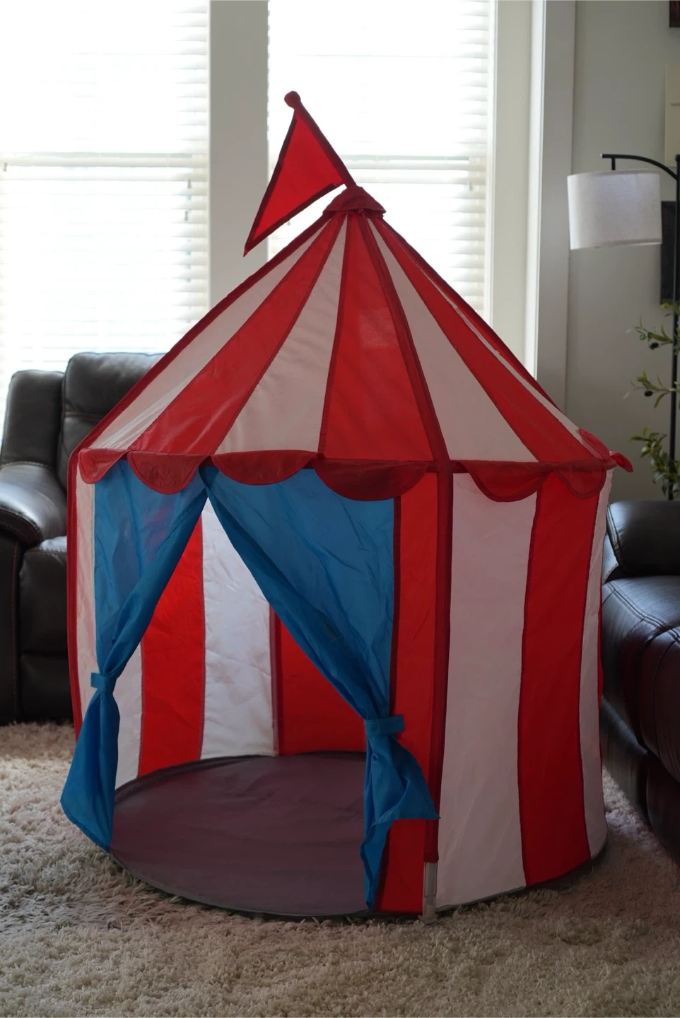 A fun circus tent for kids! It's red and white with blue curtains for the entrance. Perfect for indoor play and creating a little hideaway for your little ones