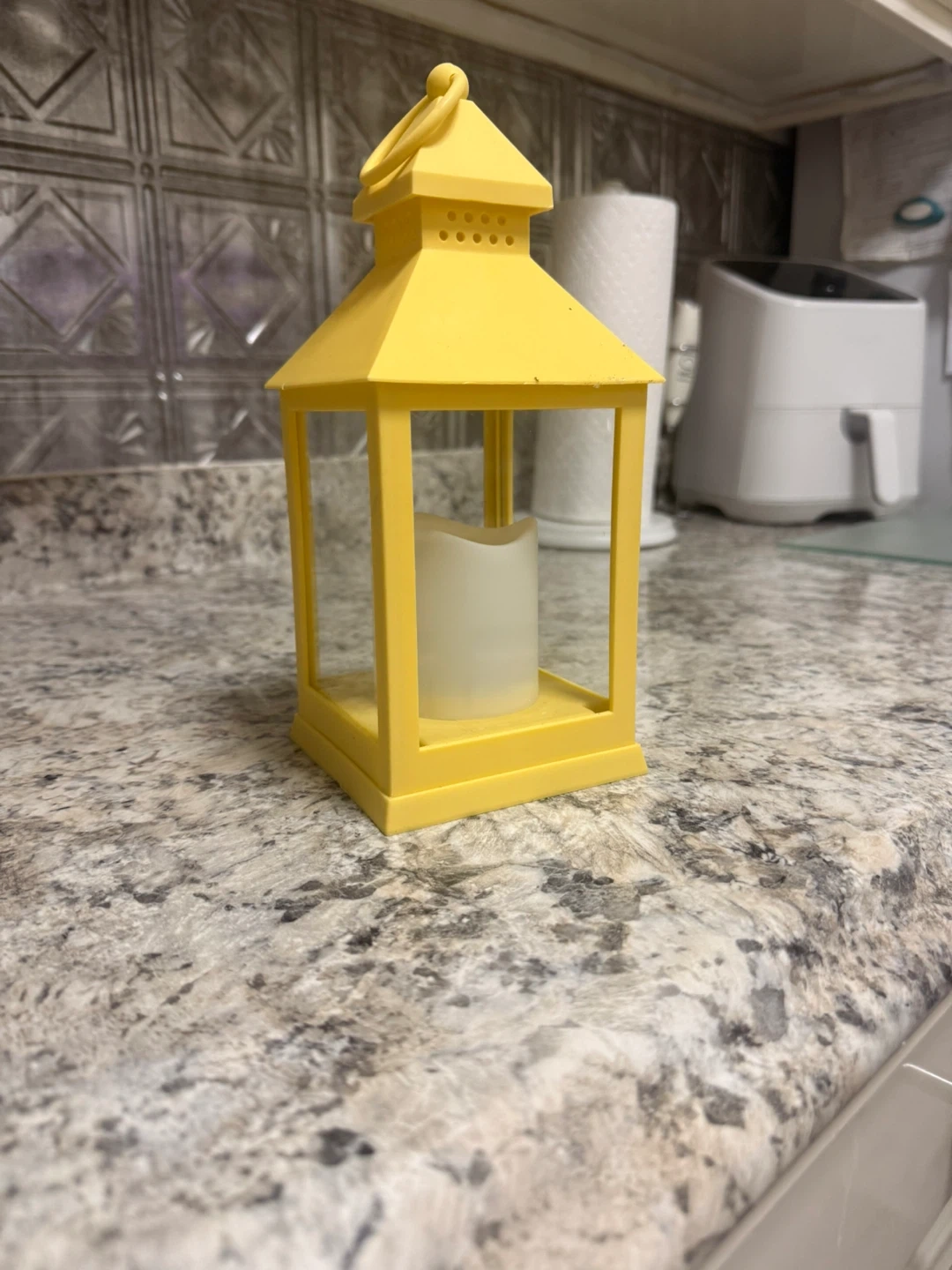 This is a bright yellow decorative lantern. It includes a battery-operated LED candle inside. It's made of metal. This lantern is perfect for adding a cozy glow to any room or outdoor space!