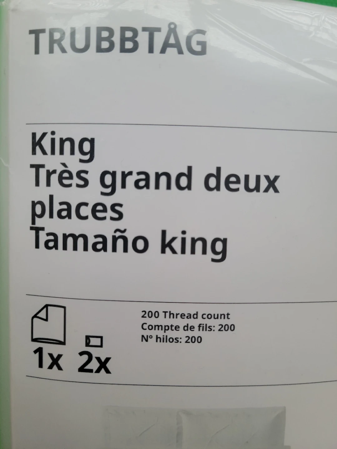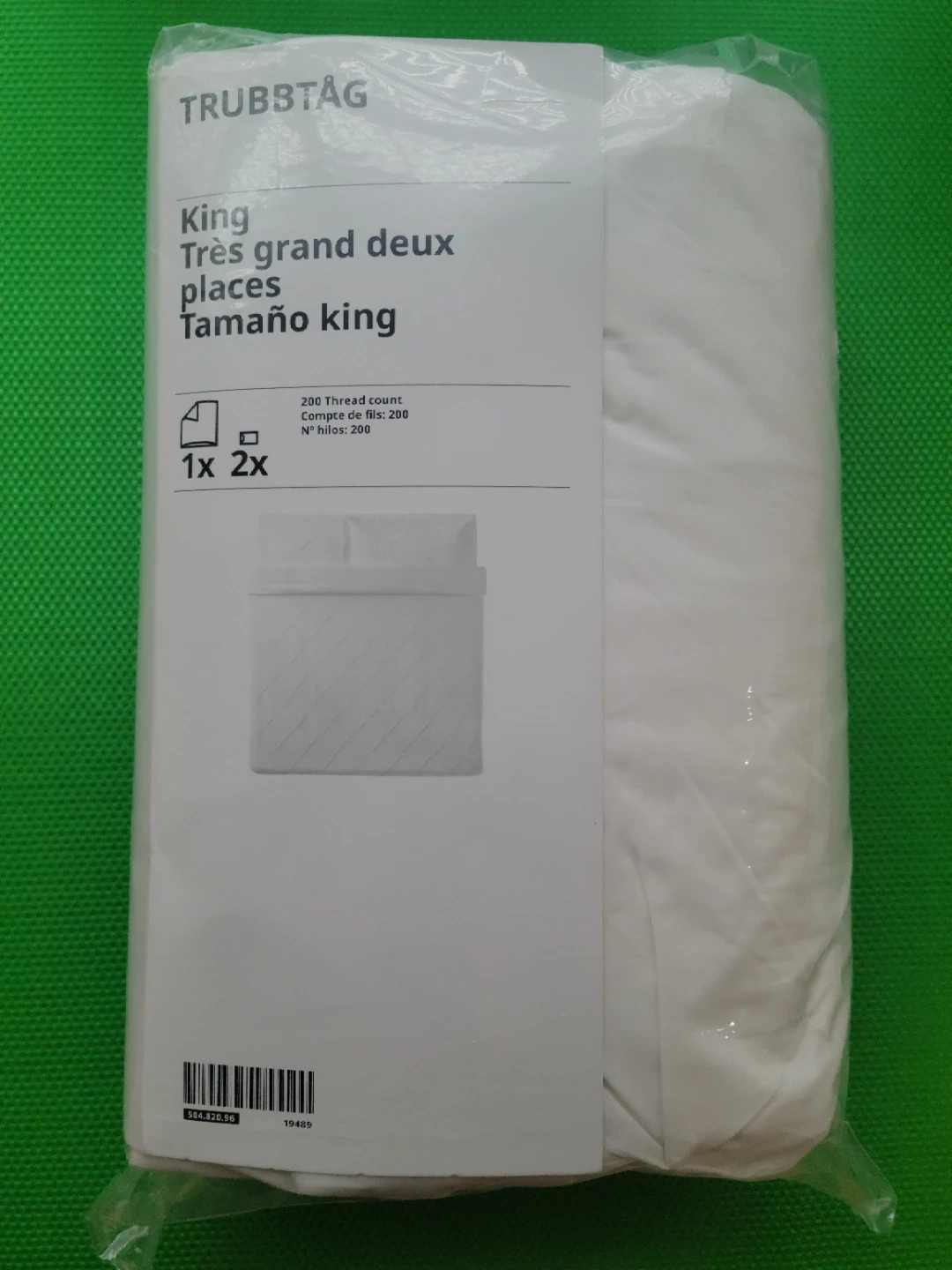 This is a King size duvet cover from IKEA's TRUBBTÅG collection. It's white and made from 100% cotton with a 200 thread count. Includes one duvet cover measuring 250x232 cm and two pillowcases measuring 51x69 cm.
