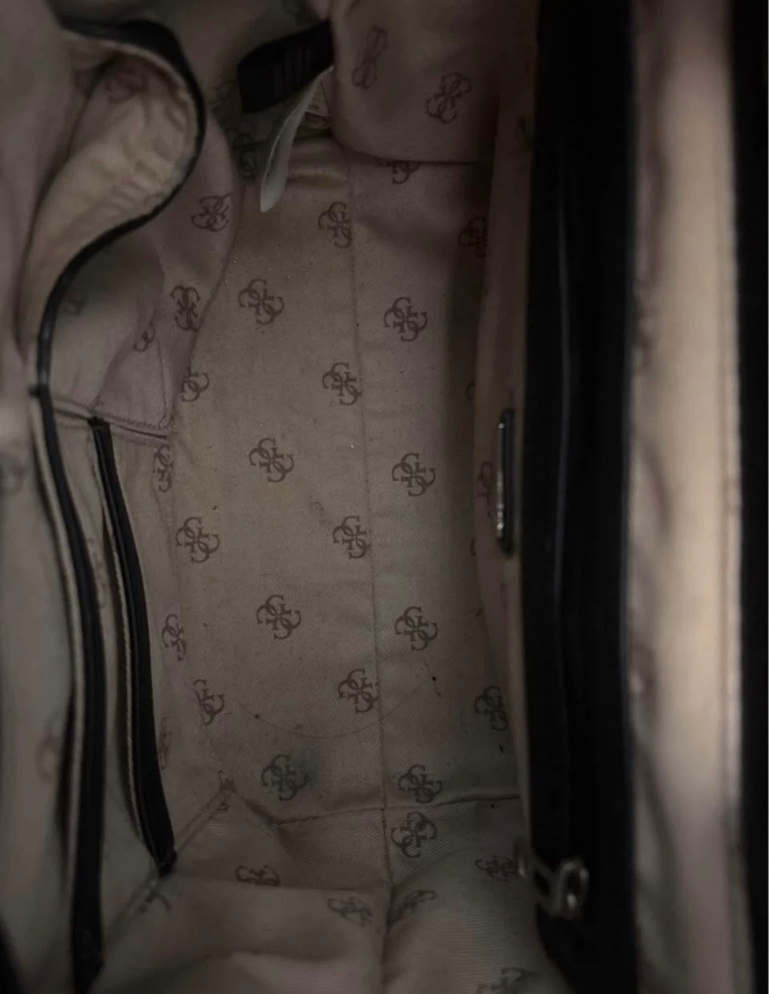 This Guess backpack purse has a stylish tweed exterior with black faux leather trim. It features a drawstring closure and a front flap pocket. Perfect for everyday use!