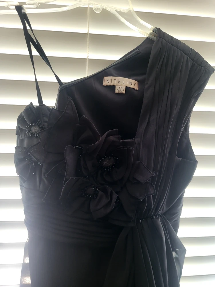 Elegant black one-shoulder dress by Nitelina. It features a beautiful floral applique with bead accents on the bodice and a flattering draped skirt. Size 6. Perfect for special occasions!