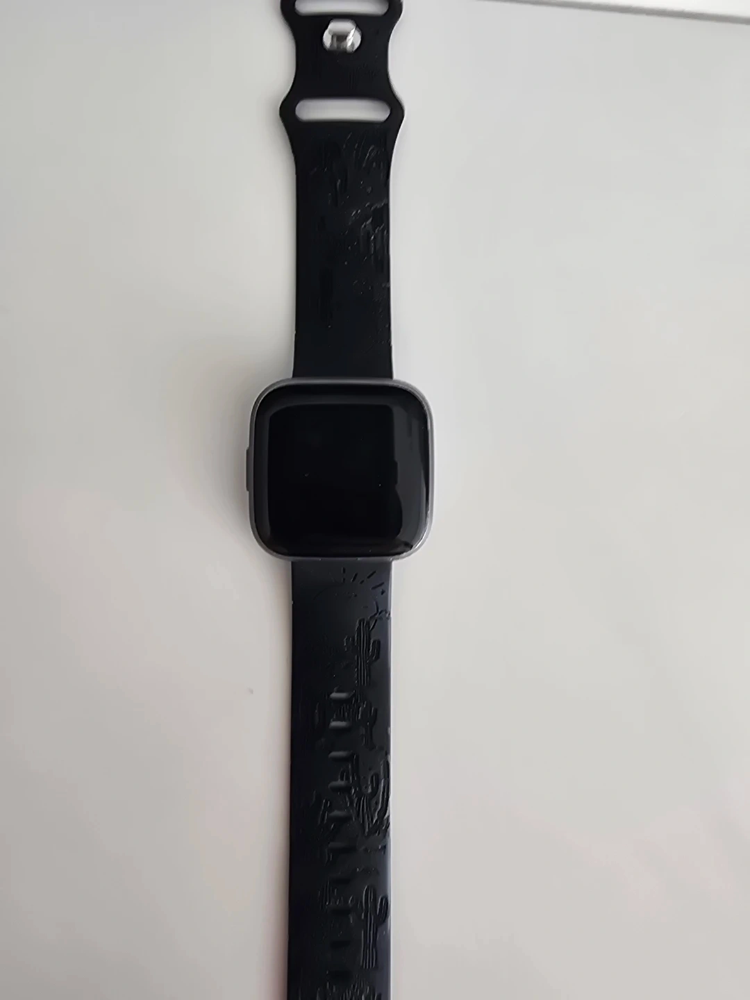 This is a Fitbit Versa 2 smartwatch with a black band featuring a cactus design. It does have a scuff on the screen in the top right but does not effect functionality. Comes with a charger.