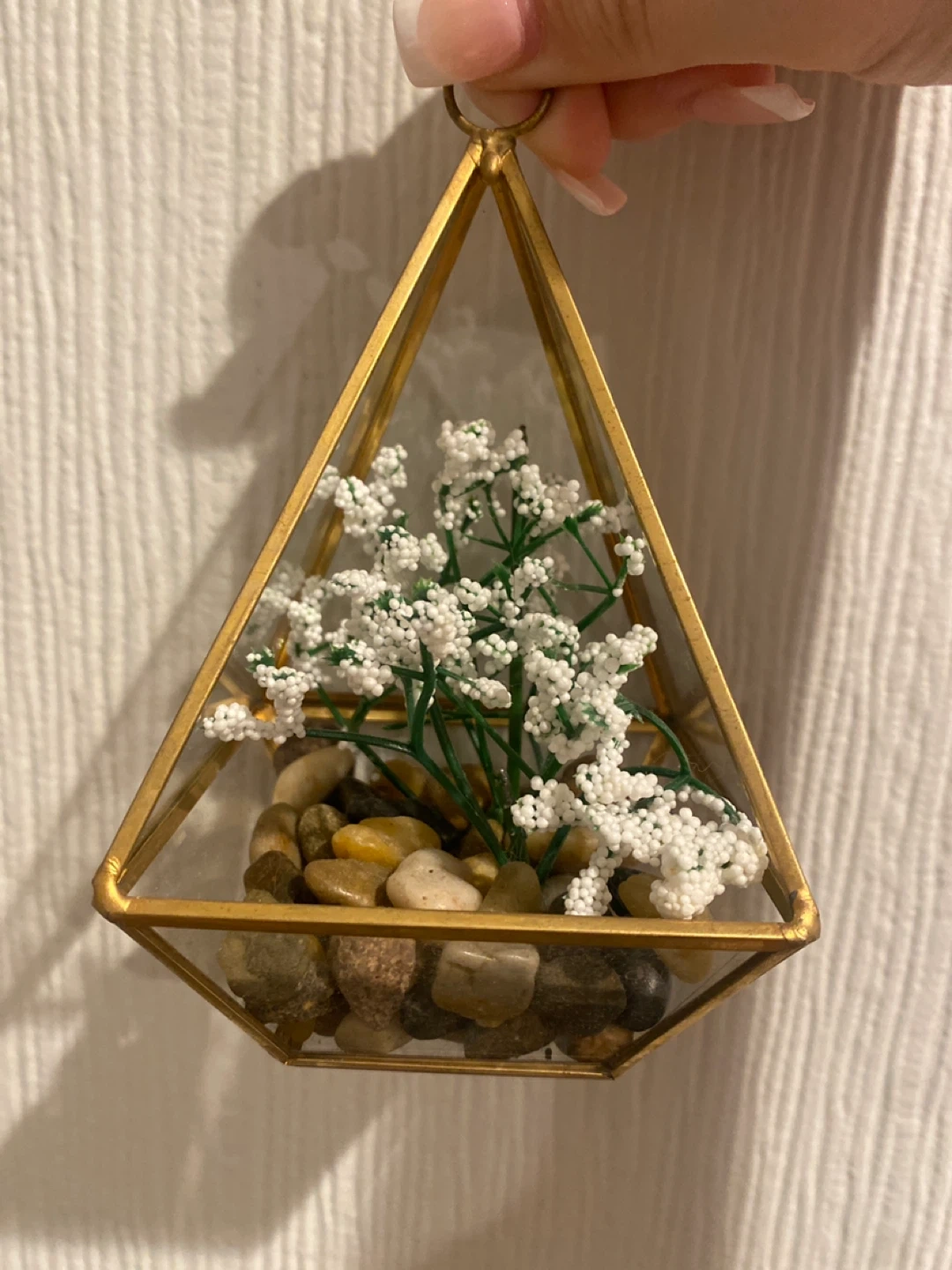 A geometric glass terrarium with gold-toned metal trim. It holds small river stones and faux white baby's breath flowers. This piece is perfect for adding a touch of greenery to a small space.