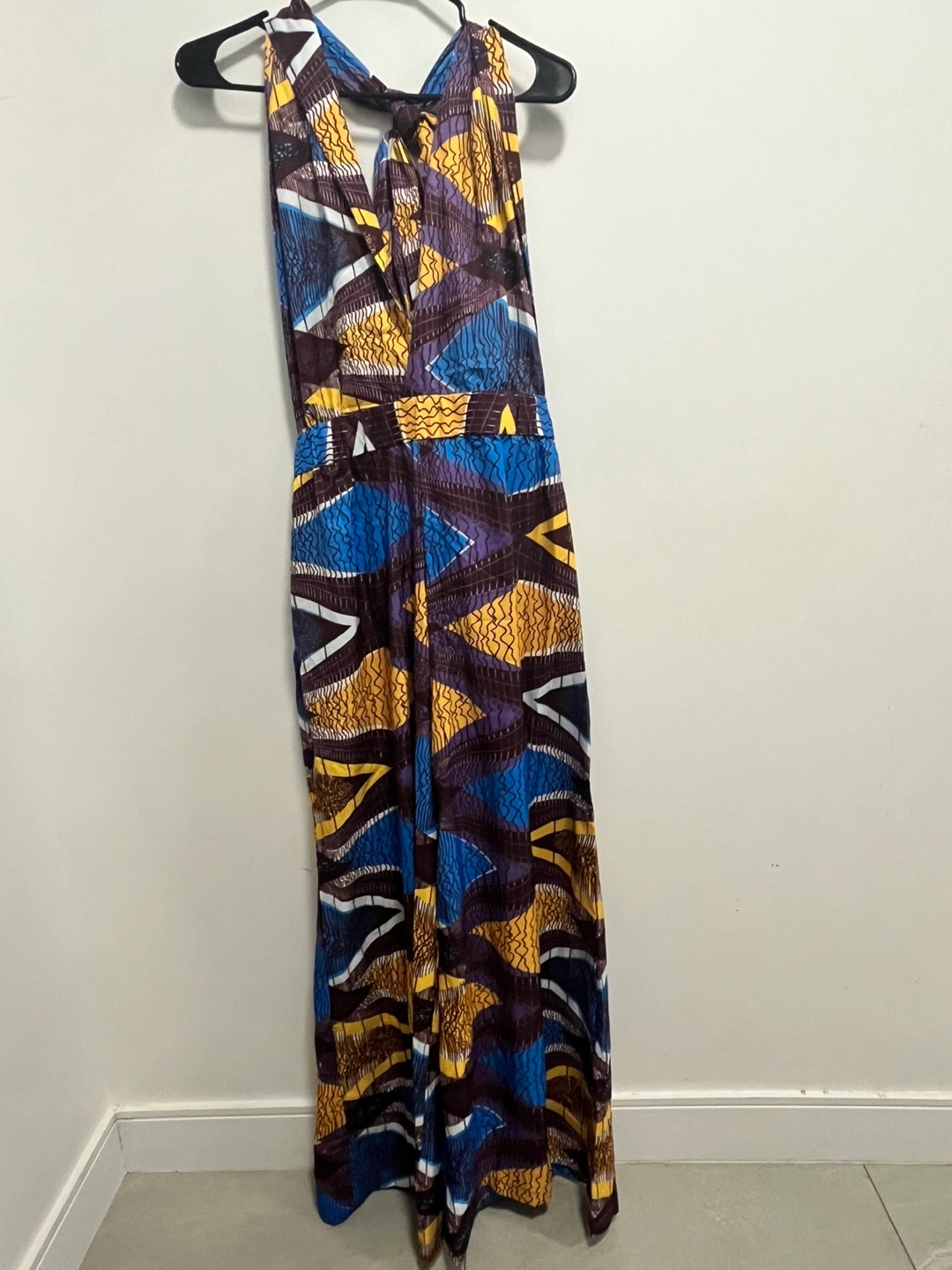 Gorgeous African style jumpsuit. Features a halter neck and vibrant geometric print. Flowy and comfortable. Perfect for summer.