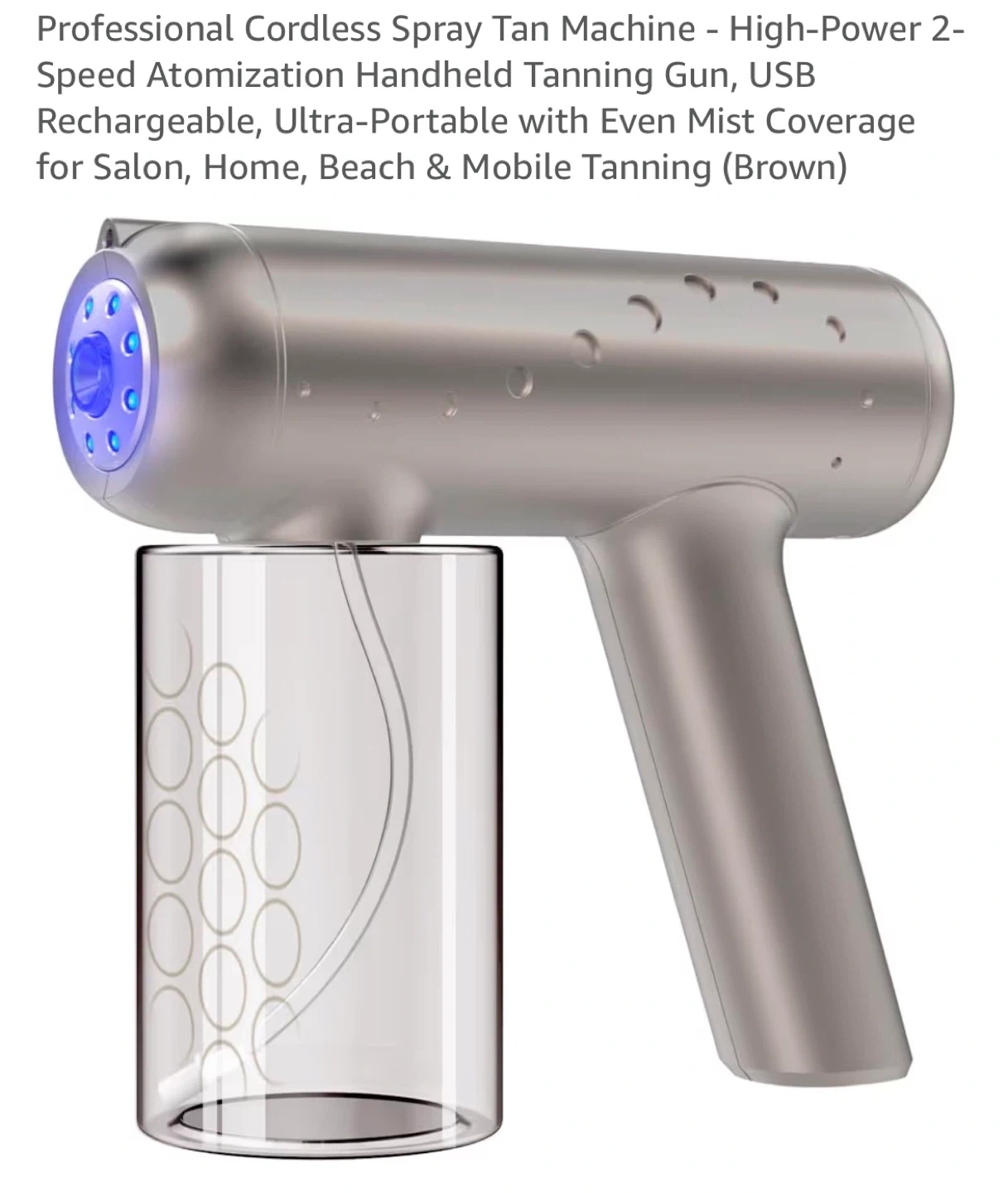 Professional cordless spray tan machine with blue light NANO technology. It features 2 adjustable spray levels for even mist coverage. The container holds 300 ml and it charges via Type-C.