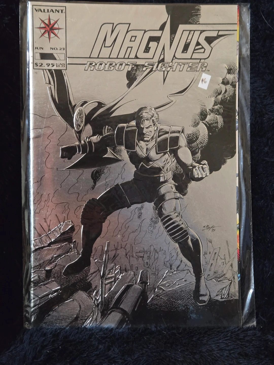 Magnus Robot Fighter comic book issue #25 from Valiant. Features a special silver cover. This is a classic comic for collectors and fans of the series.