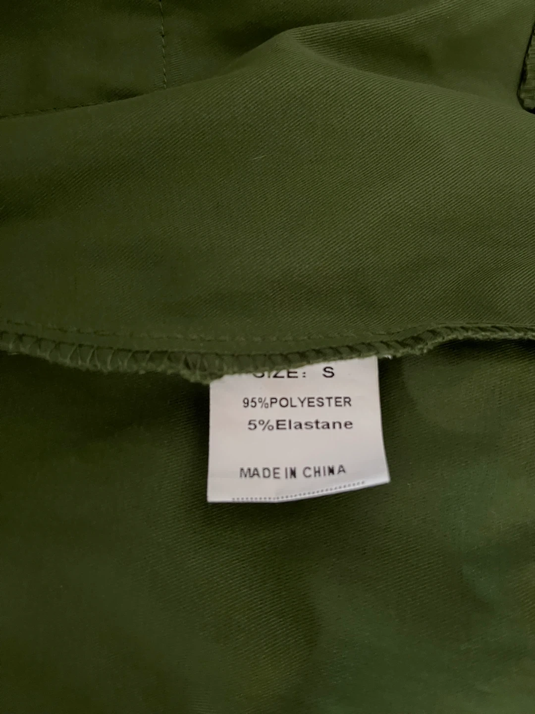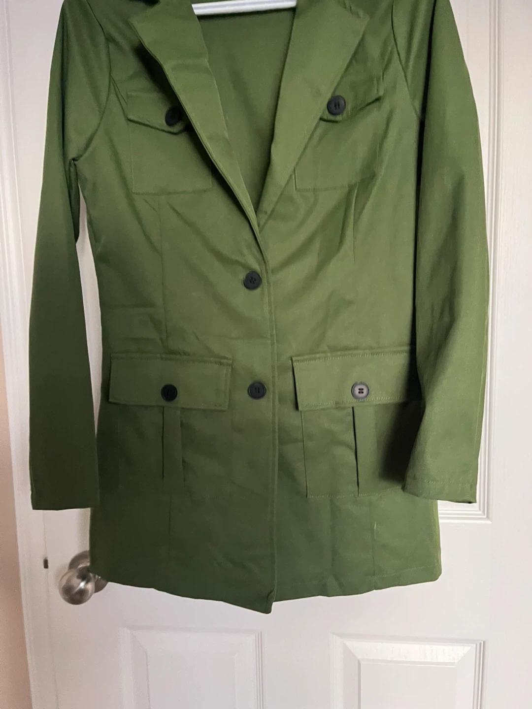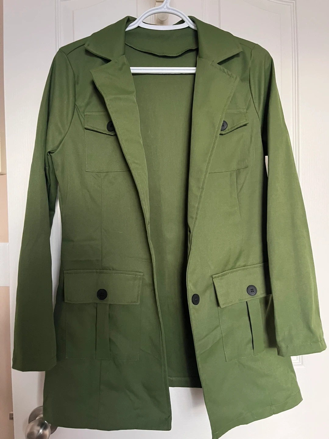 This stylish brand new green utility blazer jacket features a button-up front and four pockets. Made with 95% polyester and 5% elastane. Size S. It's a versatile piece for any wardrobe!