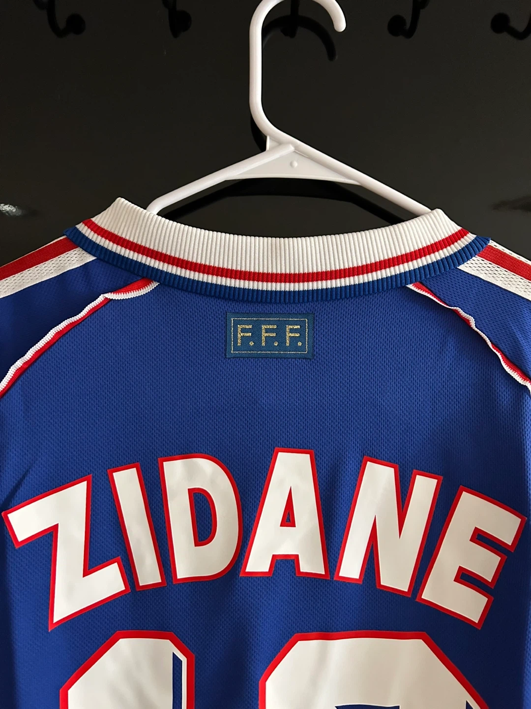 This is a classic Adidas France national team soccer jersey from the 1998 FIFA World Cup. It features the iconic number 10 and Zidane's name on the back. Polyester fabric construction.