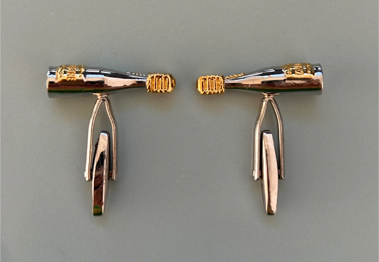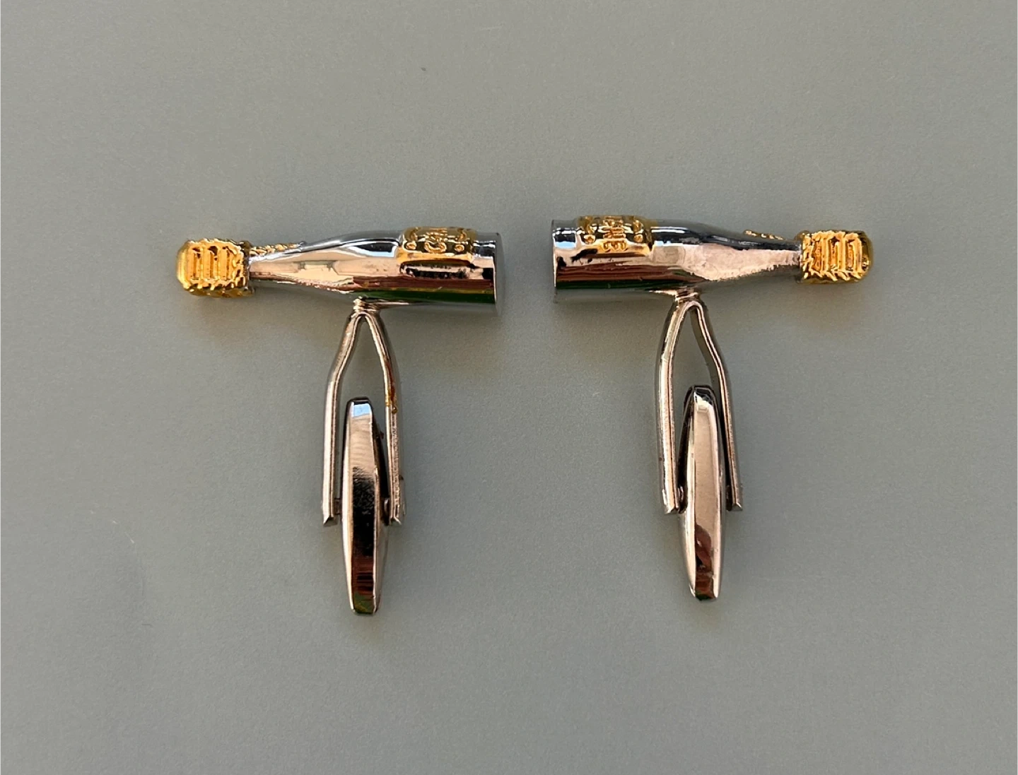 A pair of cufflinks designed to look like champagne bottles with gold accents. Silver-toned metal construction. These'd add a festive touch to any dress shirt!