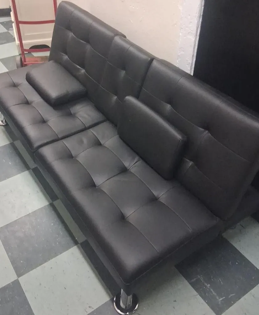 This is a black faux leather futon that converts into a sofa bed. It comes with two matching throw pillows. The tufted design and chrome legs add a modern touch to any room.