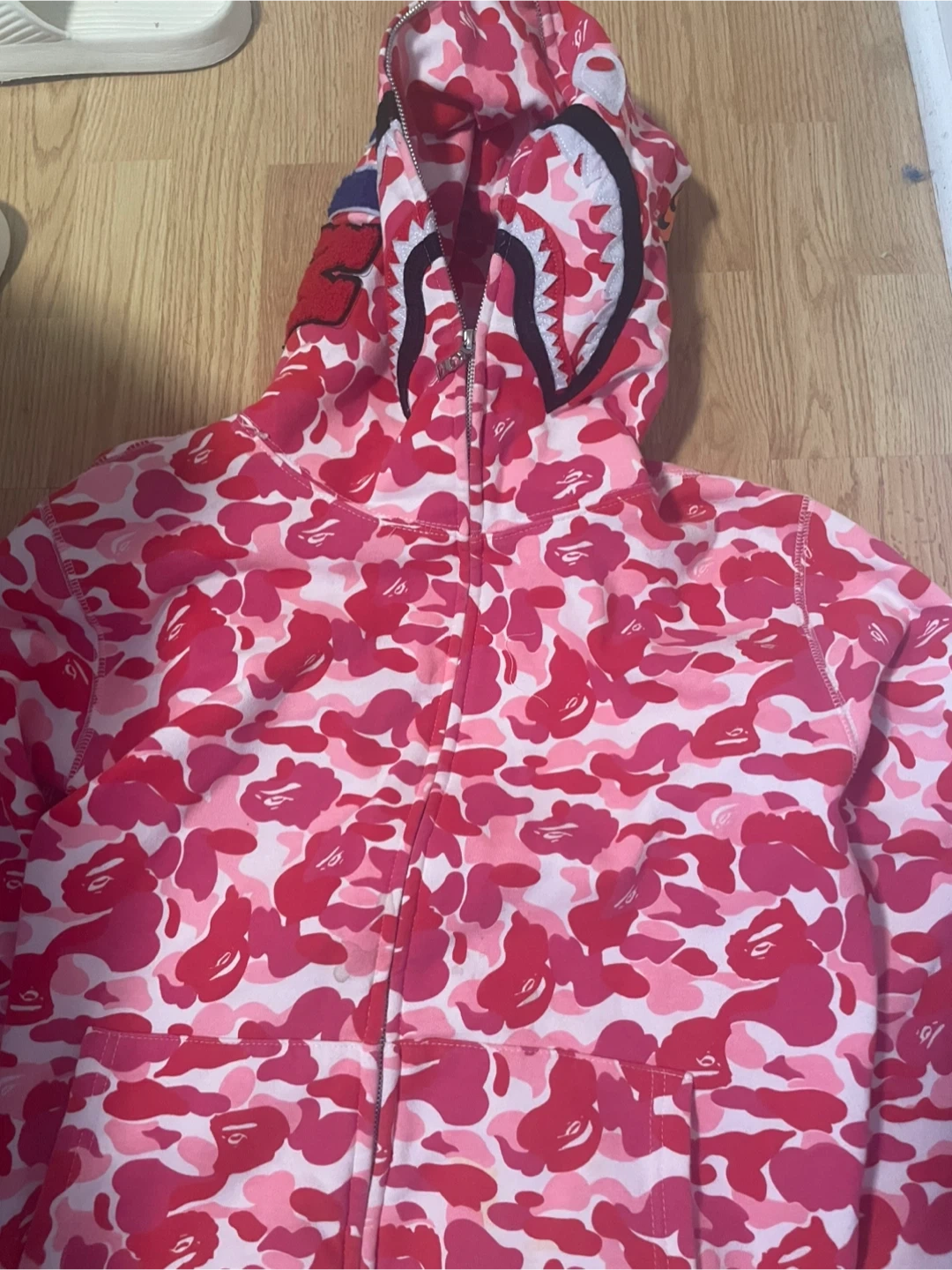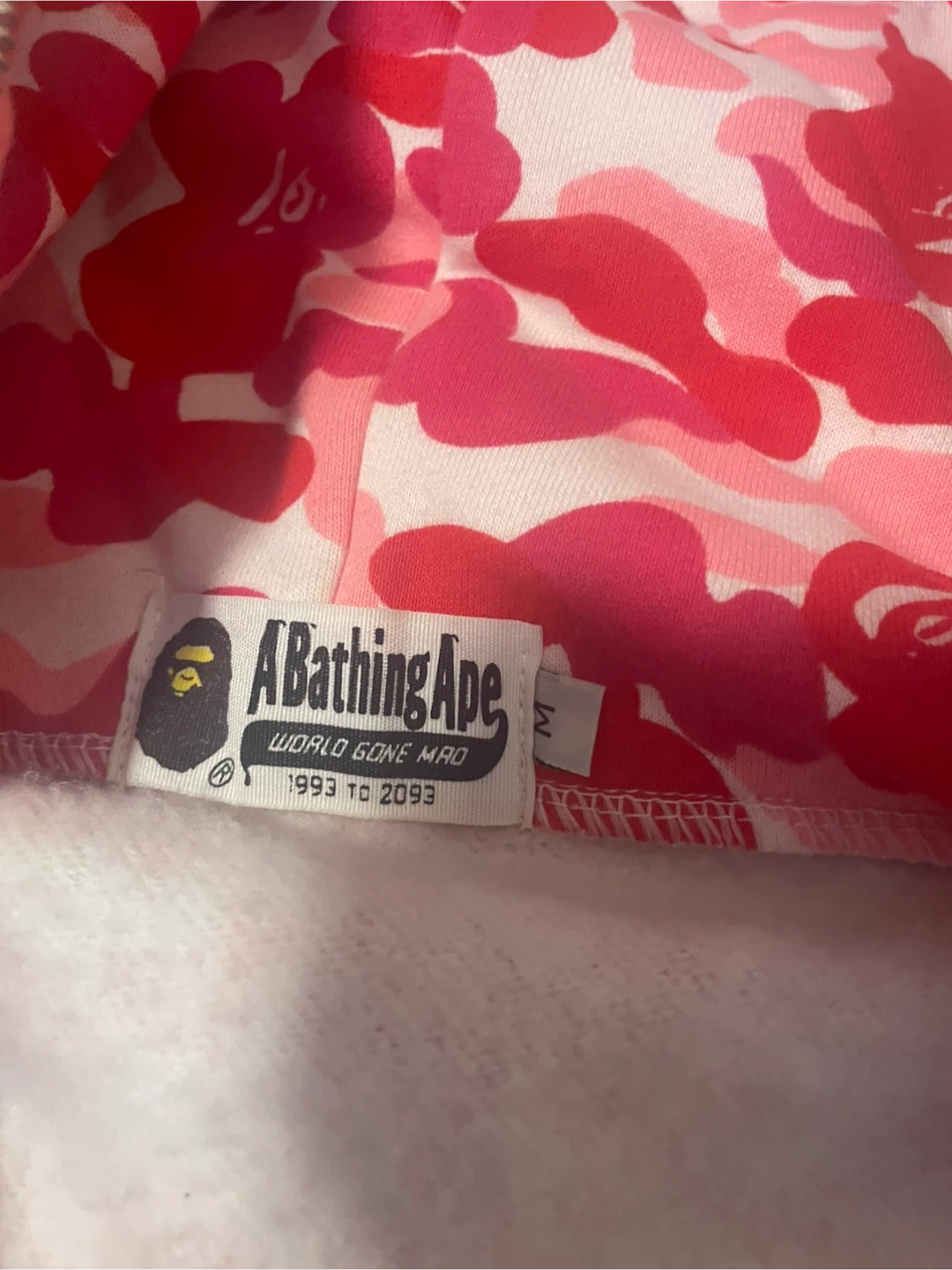 This is an A Bathing Ape full zip hoodie in a pink camouflage pattern. It's made of a soft material for comfort. The hoodie comes in size medium and includes the original packaging bag.