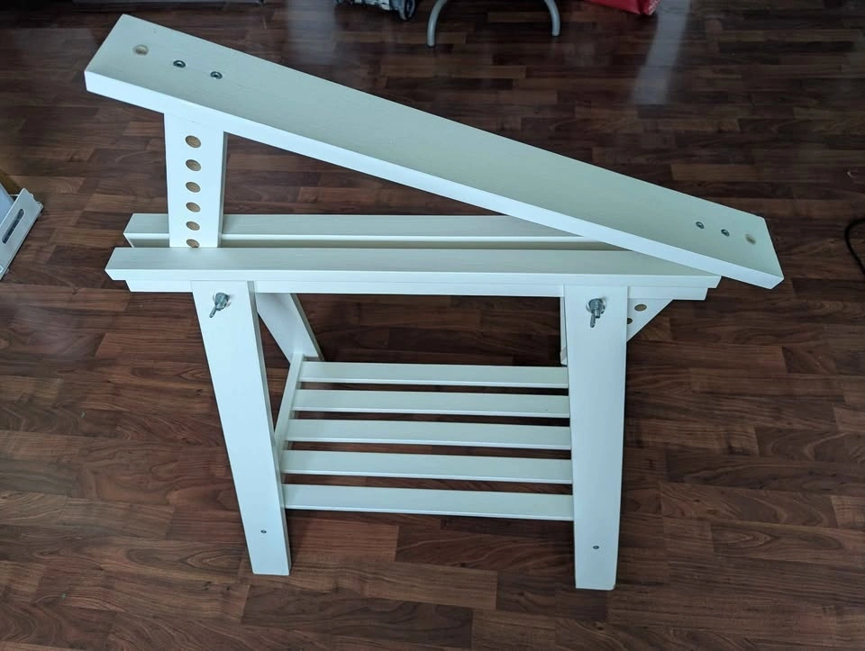 Trestle style table legs. Adjustable height and angle. Min Height: 71cm, Max Height: 93cm.