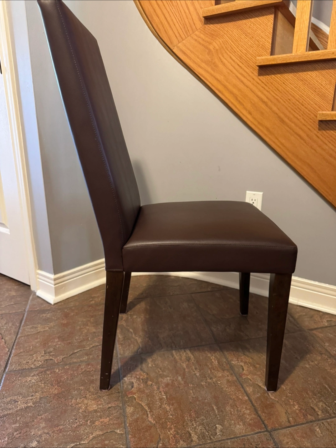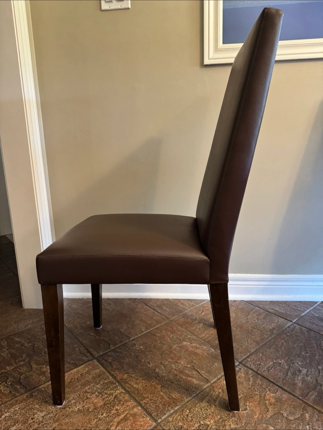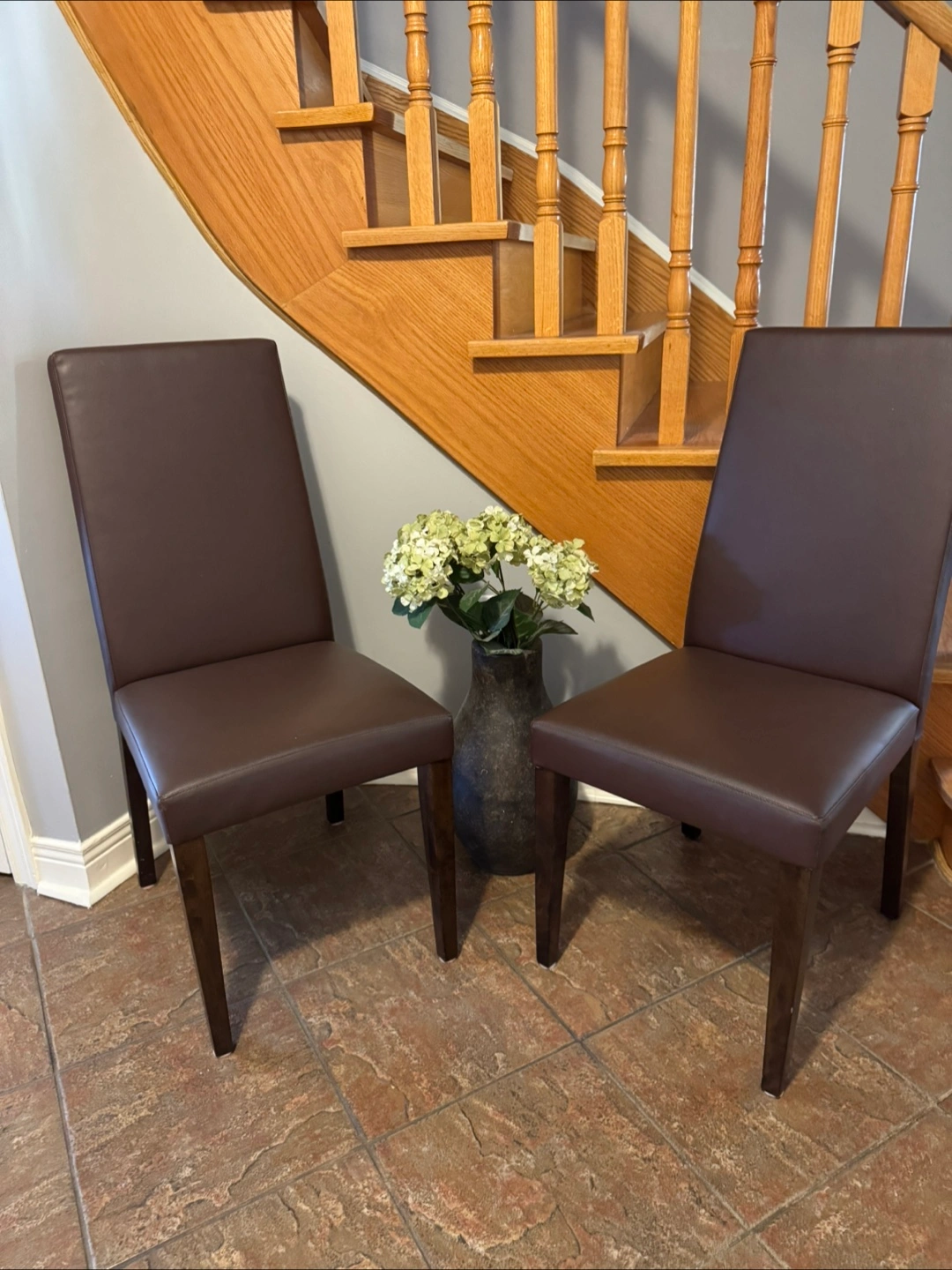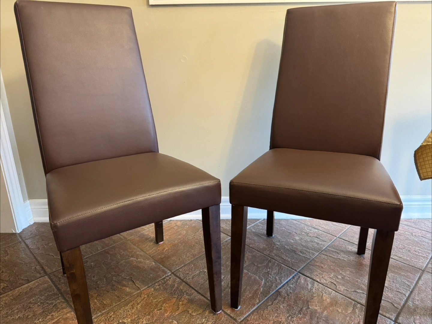 Selling a set of two brown leather dining chairs. They're in great shape and would look lovely in any dining room or kitchen. The chairs have a sleek, modern design with dark wood legs and a comfortable leather seat and back. They're sturdy and well-made, ready to be enjoyed!