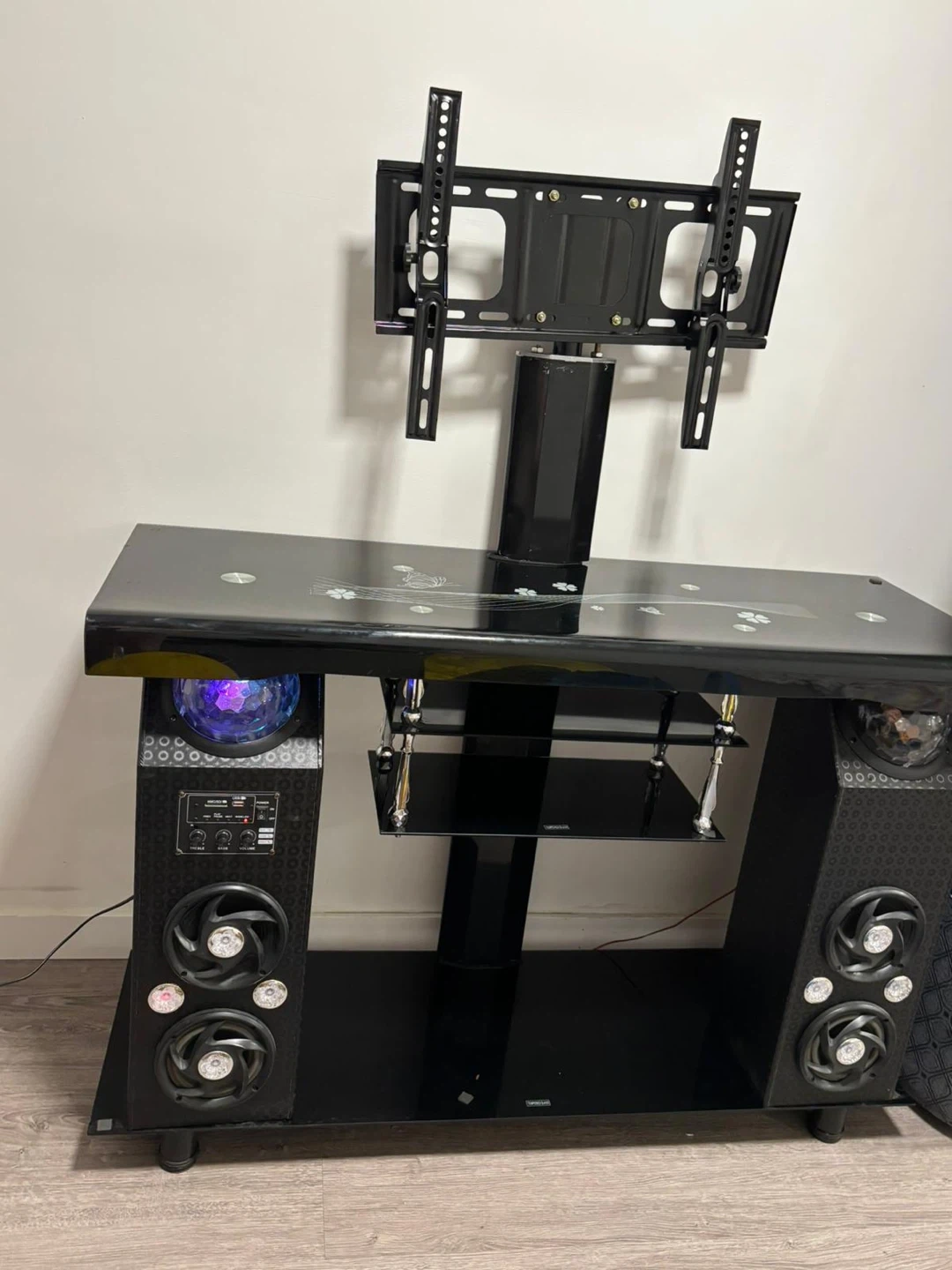 Selling a black TV stand that comes with a built-in mount and speakers. It's in great condition and ready to use! The stand has a sleek design with a glass top and open shelving for your media devices. The speakers are integrated into the sides of the stand for a clean look and enhanced audio experience. Perfect for any living room or entertainment area