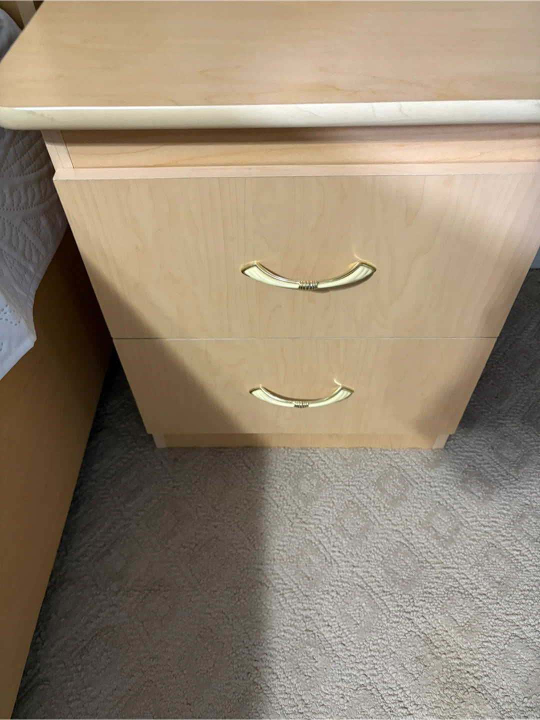 This light wood nightstand features two drawers with curved gold-toned hardware. Its light wood finish complements most bedroom decors. Provides convenient bedside storage.