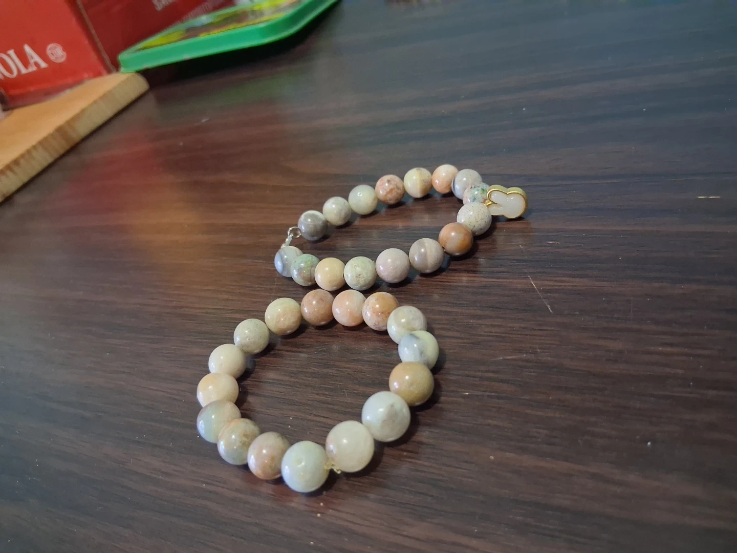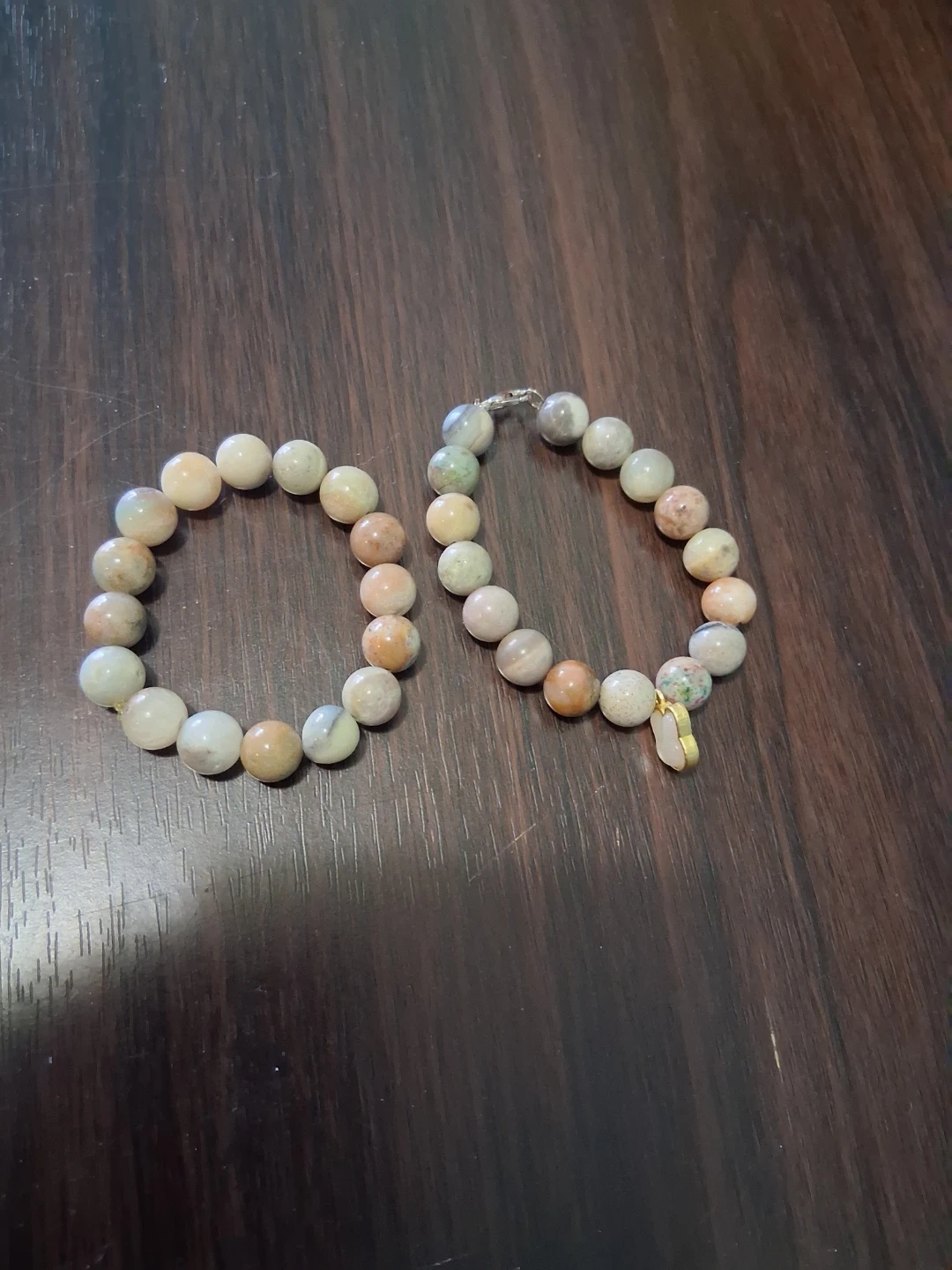 Two stretch bracelets with natural stone beads. Each bracelet features a mix of beige, white, and light green stones with a small charm on one. They're stretchy and ready to wear!