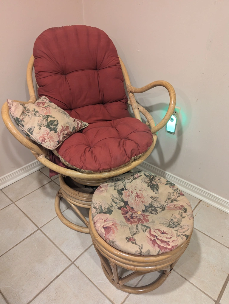Selling a charming rattan swivel rocker chair with a matching ottoman. The chair features a comfortable, cushioned seat and backrest in a lovely maroon colour. It also comes with a floral reversible patterned pillows. The ottoman has a matching floral patterned cushion. This set would be a cozy addition to any living space! Retail 700.00