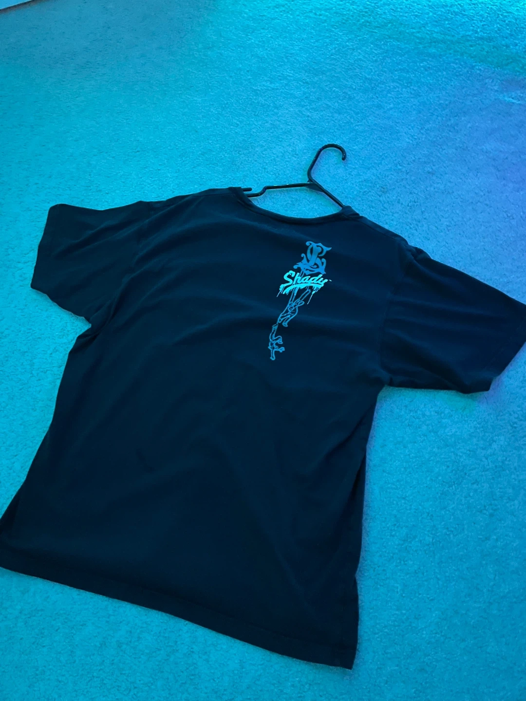 Black graphic t-shirt from Shady Records. Features a front design with puppet strings and a smaller logo on the back. Cotton material.