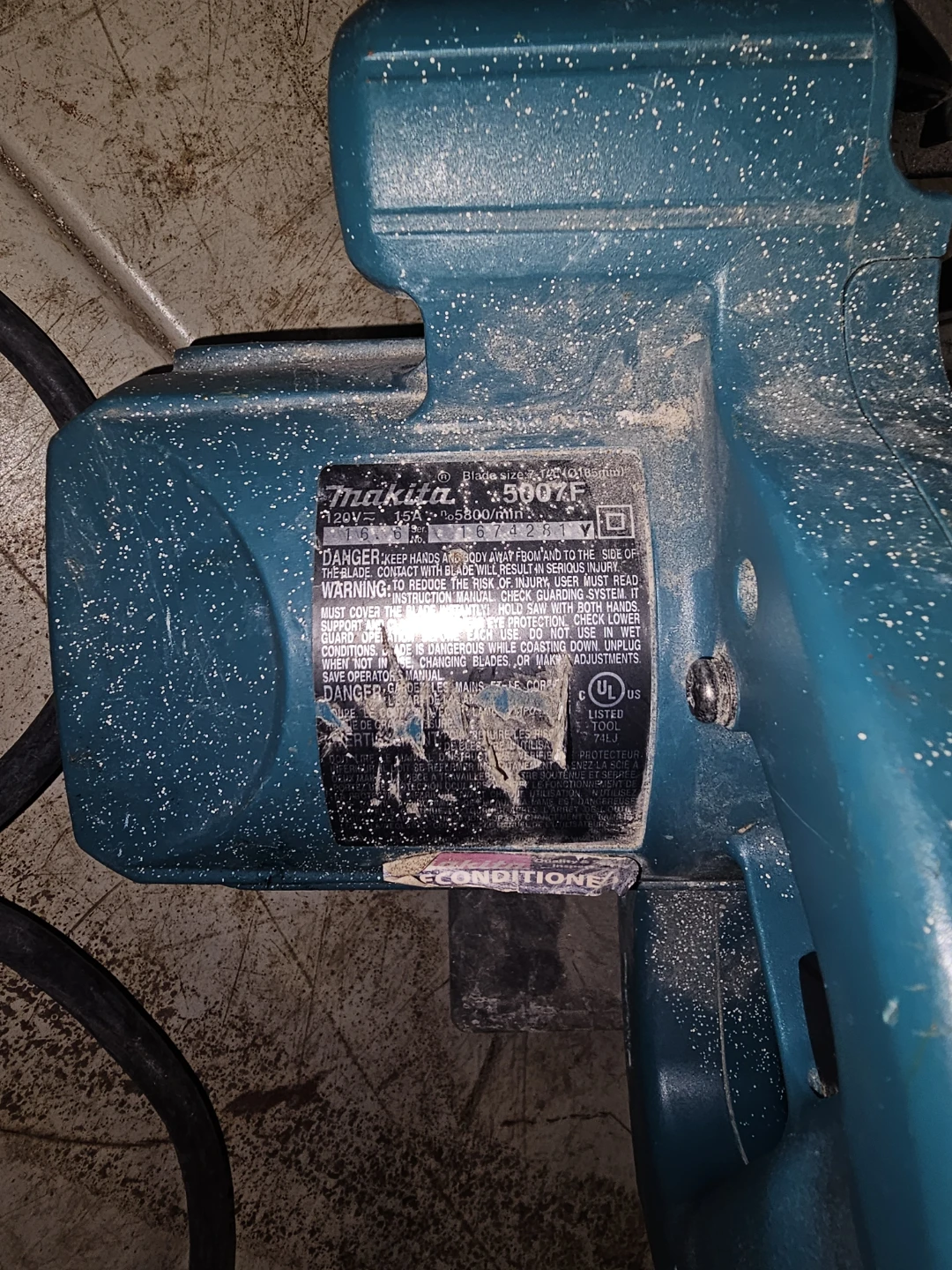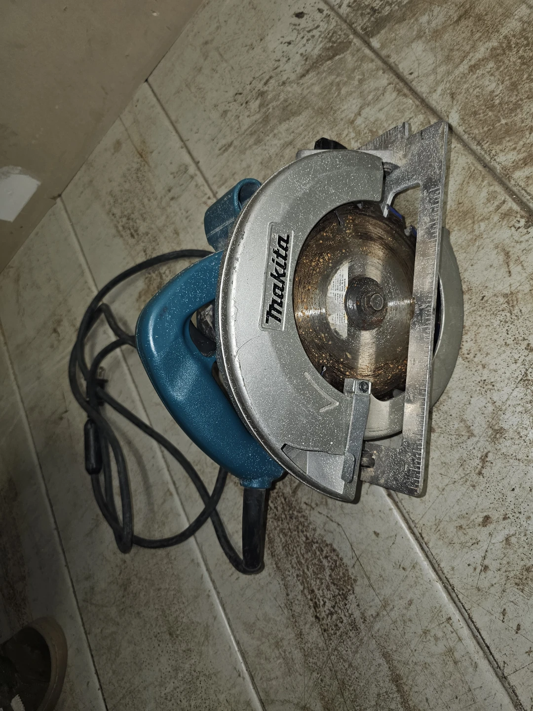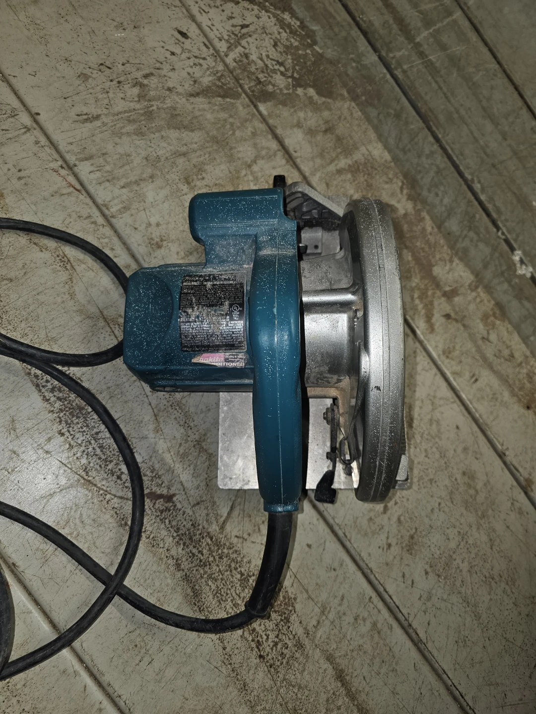 This is aused Makita 5007F circular saw. It has a 15 Amp motor and a 7-1/4 inch blade capacity. Power cord included. Works well for various cutting tasks.