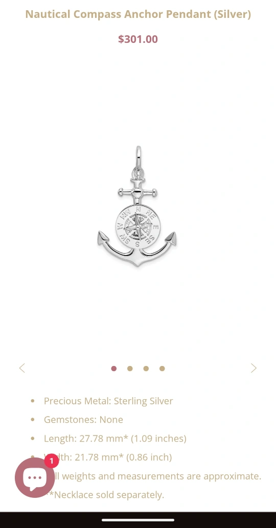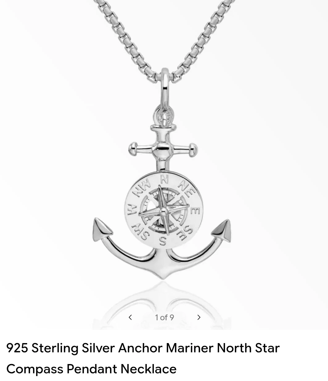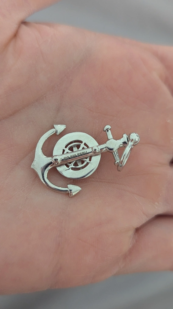 This pendant features a sterling silver anchor with a mariner compass design. It's stamped "925 PERU" on the back. The pendant measures approximately 1.5 inches in length.