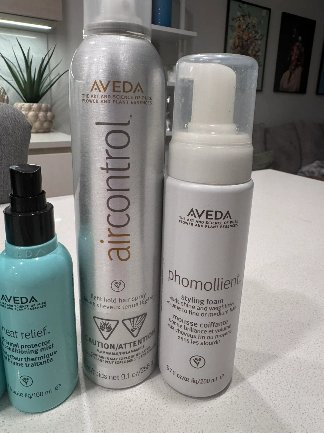 Includes Aveda Air Control light hold hair spray (9.1 oz), Phomollient styling foam (6.7 oz), Foam Reset rinseless hydrating hair cleanser (5 oz), Rinseless Refresh micellar hair & scalp refresher (6.7 oz), and Heat Relief thermal protector conditioning mist (3.4 oz). These products are designed for styling and refreshing hair.