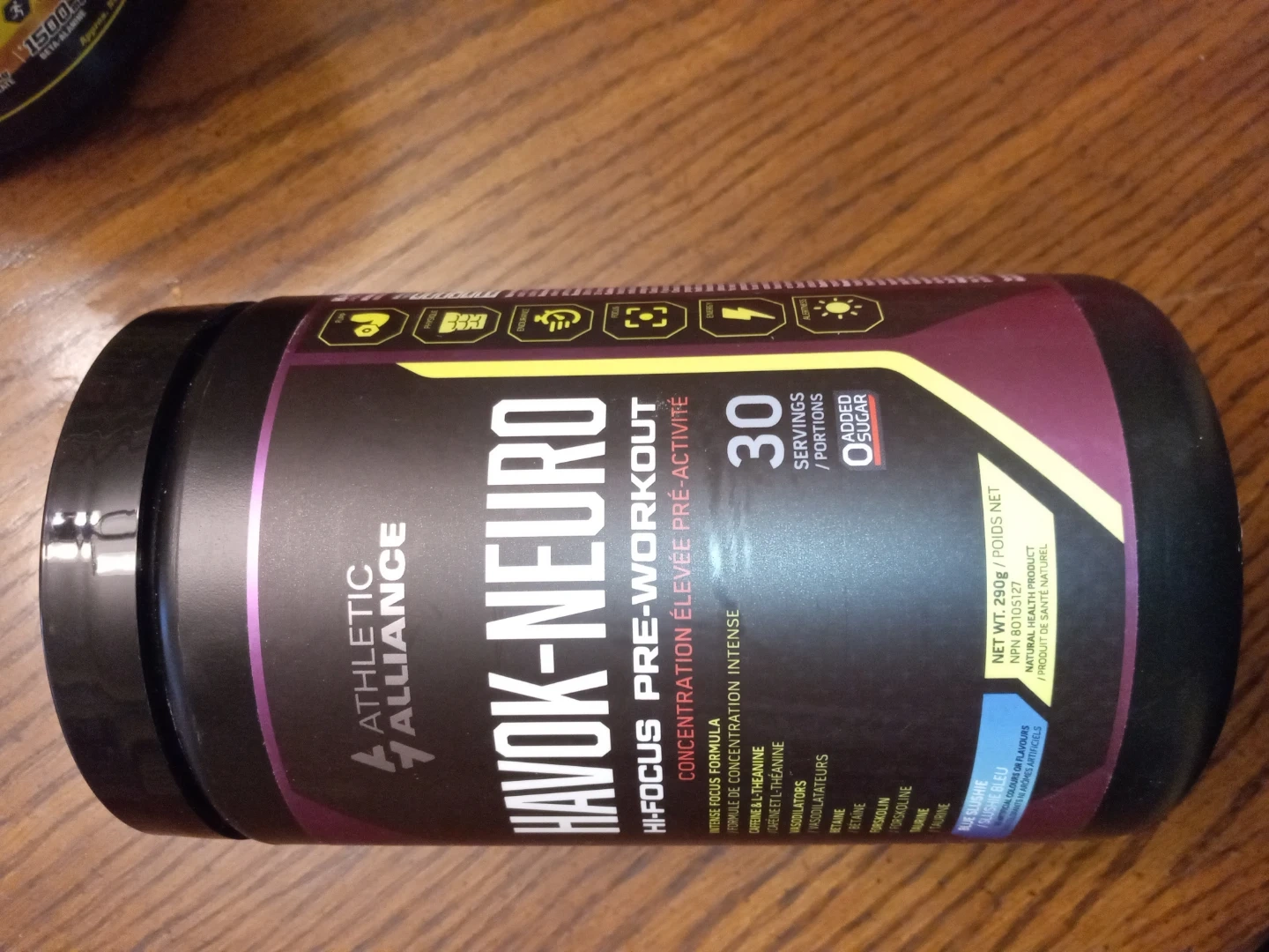 This is a container of Athletic Alliance Havok-Neuro Hi-Focus Pre-Workout in Blue Slushie flavour. It contains 30 servings and 0 added sugar. The net weight is 290g.