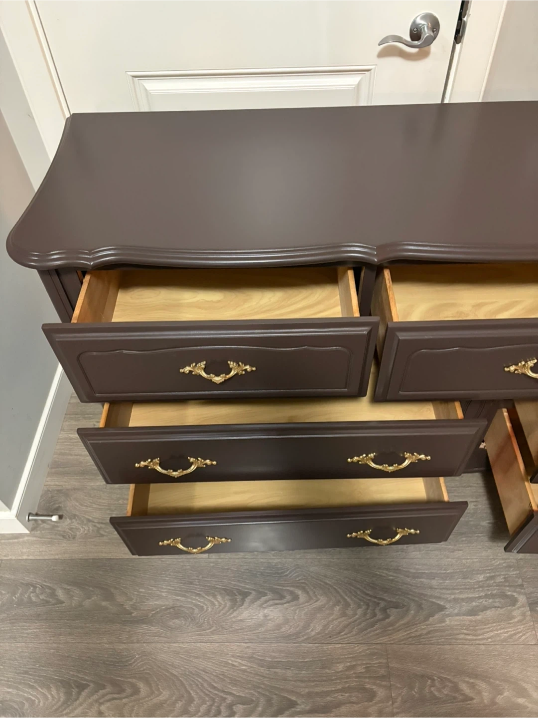This refinised dresser in rich brown colour featuring seven drawers, with gold hardware, offering ample storage and a touch of elegance to any bedroom. The drawers are very clean and slide well. Overall in excellent condition with a vintage look.