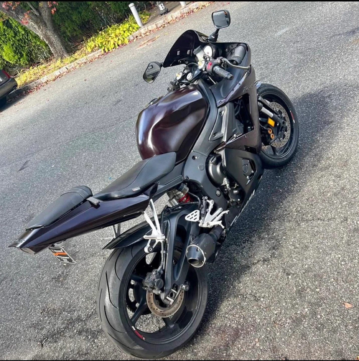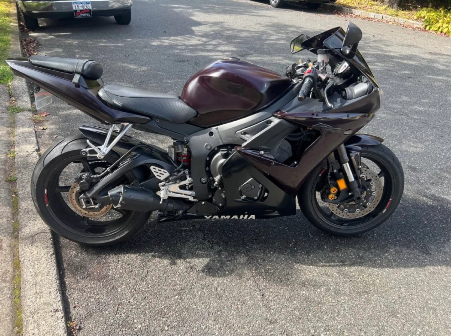 A dark red and black Yamaha sportbike motorcycle. This is a street bike with racing style fairings and a sleek design. It's ready for the road!