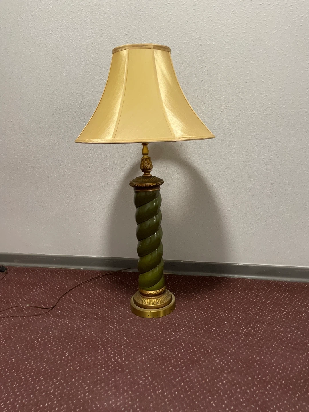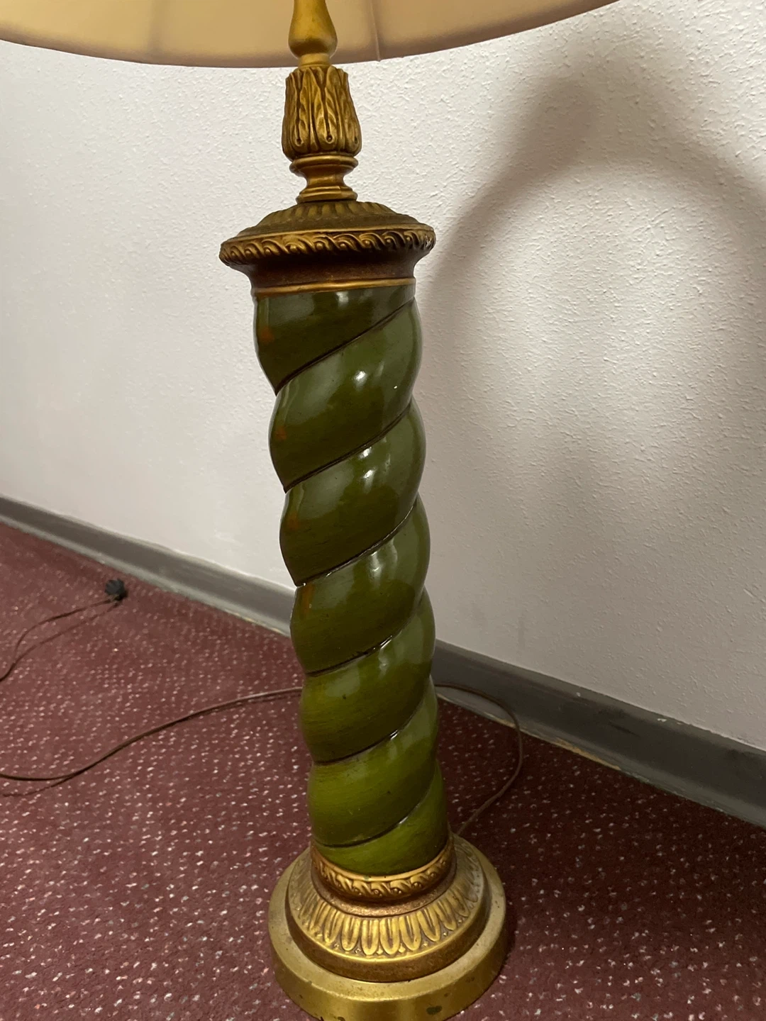 This is a stylish table lamp featuring a green, twisted column base with ornate gold accents. It comes with a pale yellow lampshade. The lamp's unique design adds a decorative touch to any room.