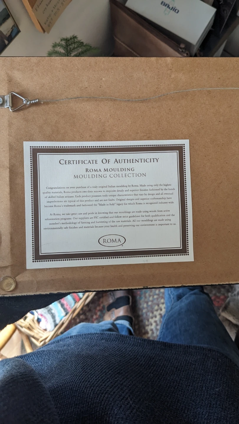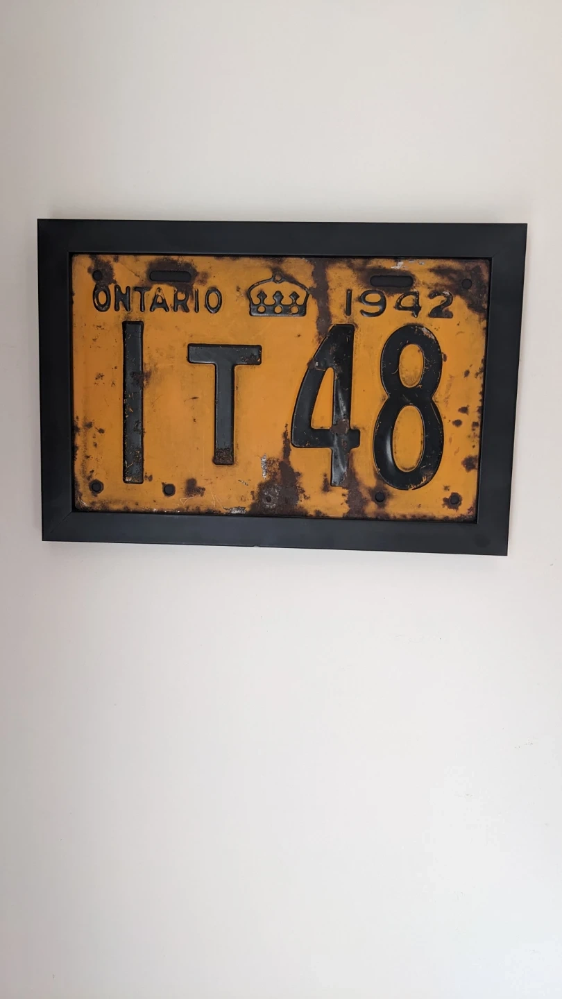 Vintage 1942 Ontario license plate framed as wall art. Features original numbering and patina. Framed in a black border.