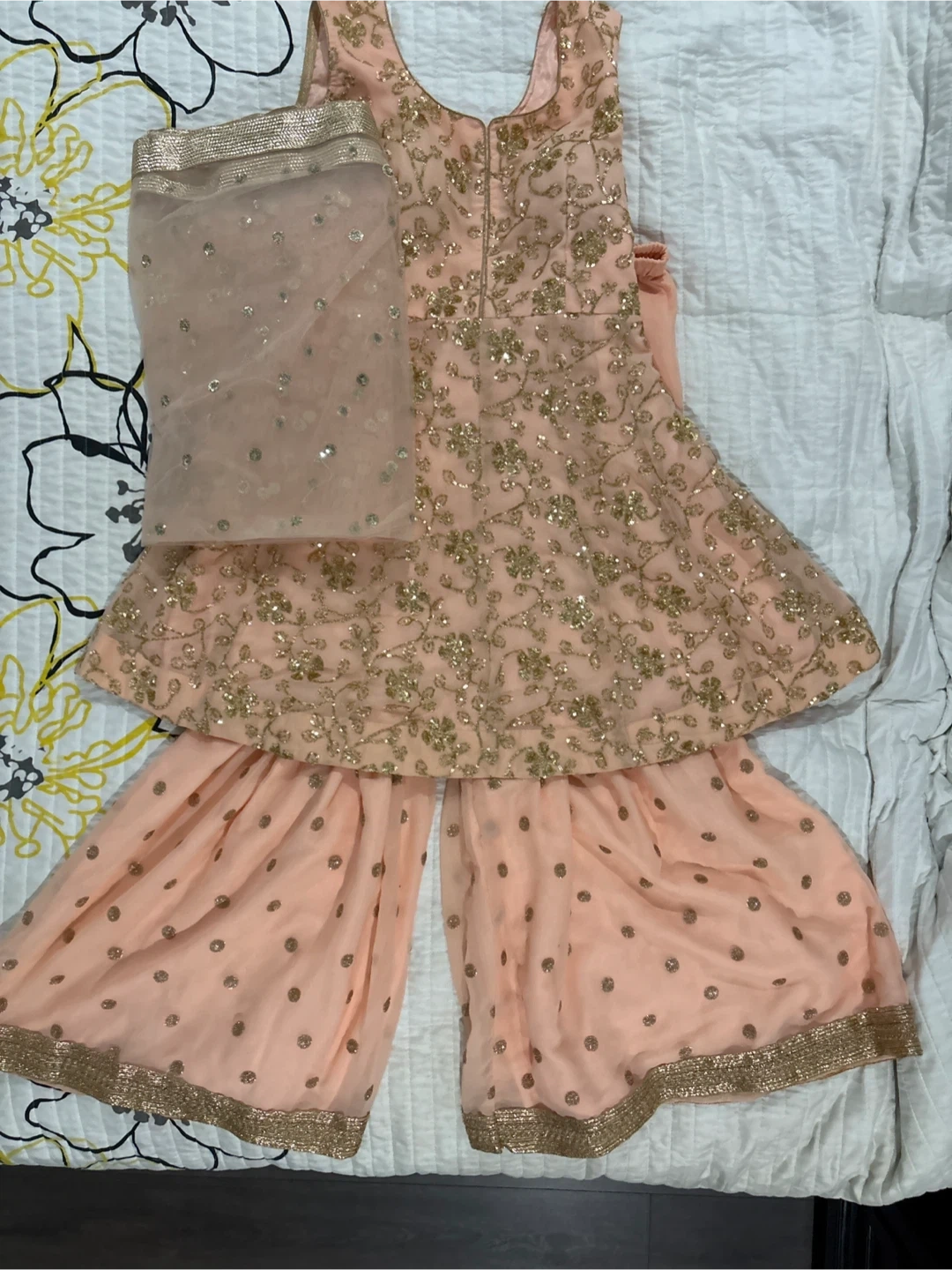 Peach-coloured slara set with intricate gold floral embroidery. Includes a matching dupatta with sequin details. Outfit's fabric appears to be a flowy georgette or chiffon. Perfect for festive occasions!