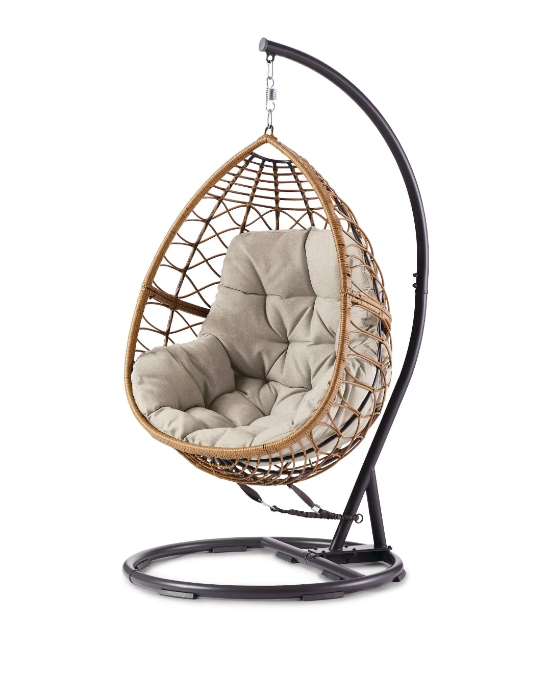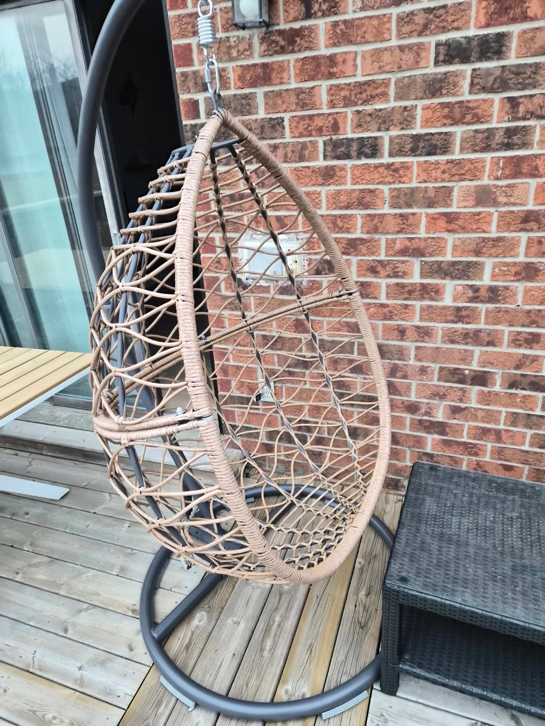 Wicker hanging chair with metal stand. Neutral beige colour. Great for relaxing on the patio or deck!