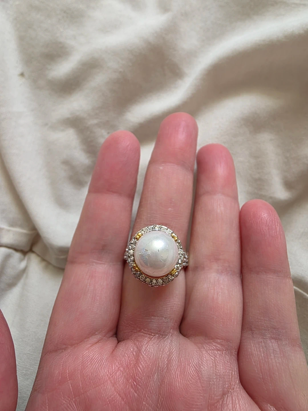 A beautiful ring featuring a large pearl surrounded by smaller diamonds and gold accents. It's set in a silver-toned metal band. This elegant piece would be perfect for special occasions.