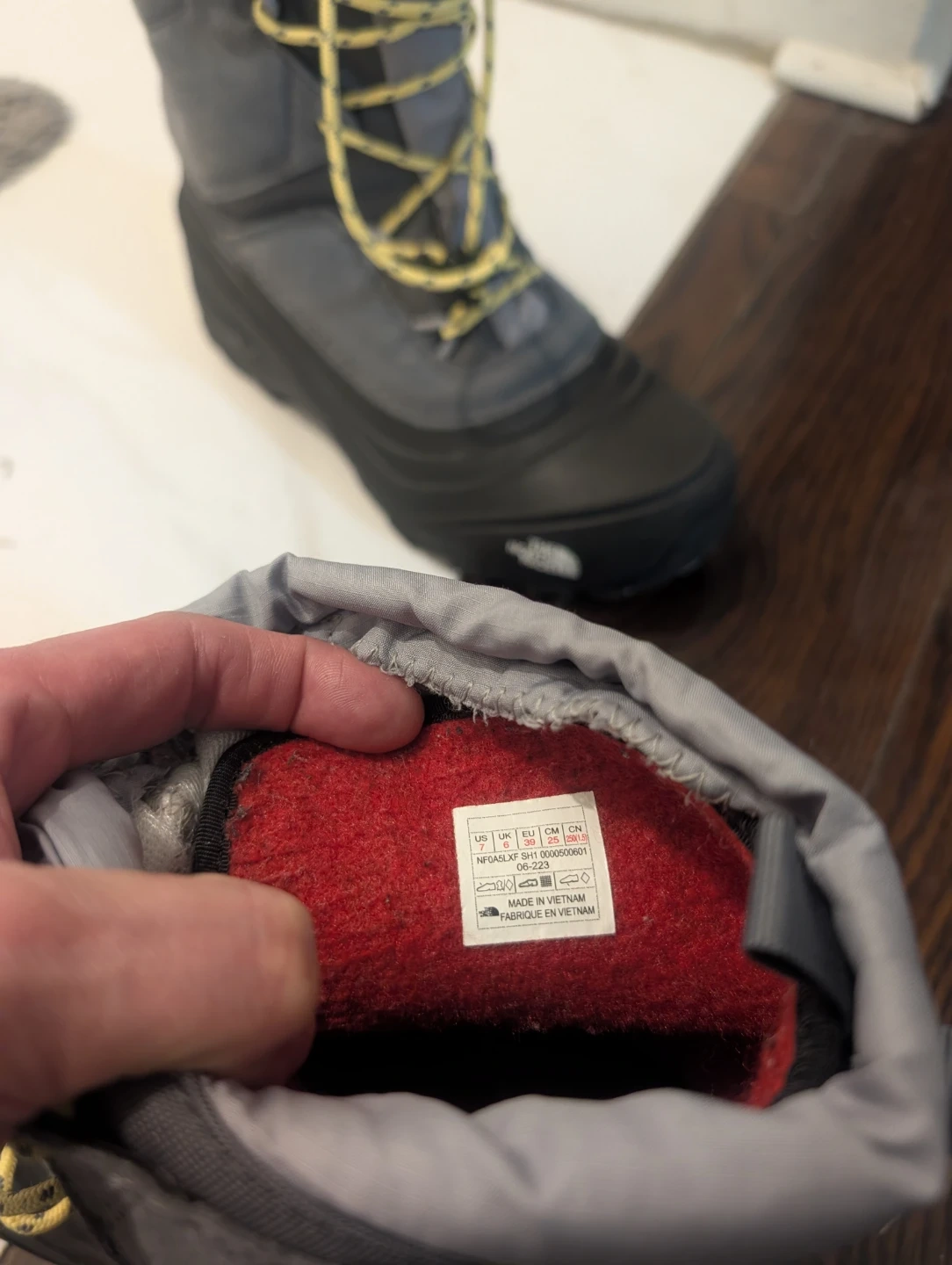 These grey and black winter boots are from The North Face. They feature a durable waterproof construction with warm fleece lining and yellow laces. Excellent for keeping feet warm and dry during cold weather!